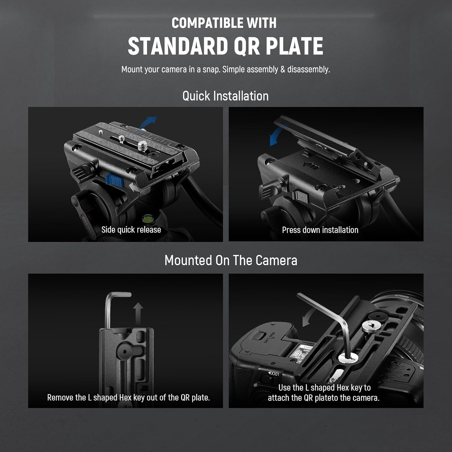 - Quick Release Plate: Compatible with Manfrotto system (1/4" and 3/8" screws)