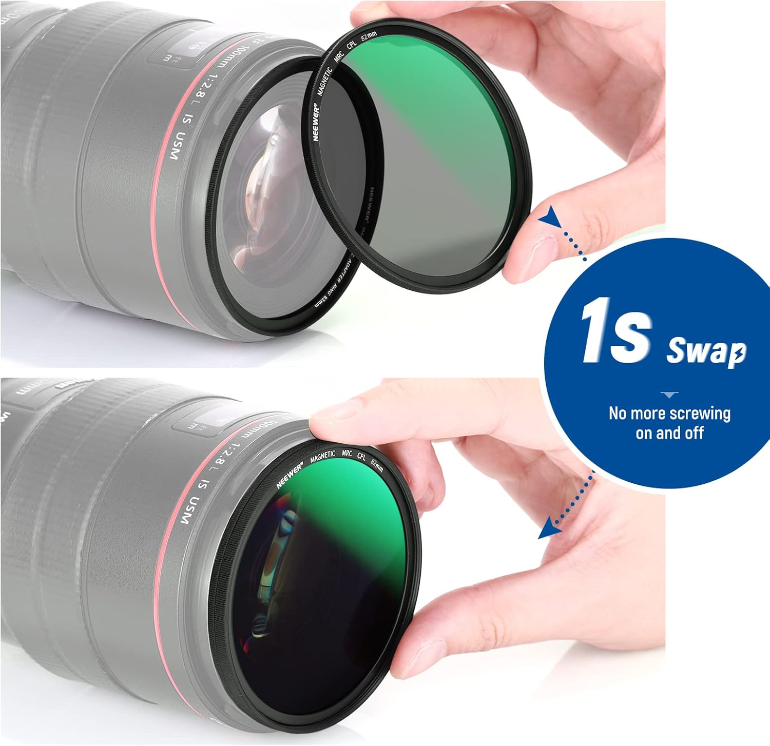 The NEEWER 82mm 4-in-1 Magnetic Lens Filter Kit provides a quick and easy way to enhance your photos. This kit includes a ND1000 filter, MCUV filter, CPL filter, and a magnetic adapter ring, all with 42-layer coating for superior performance and protection. The ultra-slim design ensures no vignetting even with wide-angle lenses.