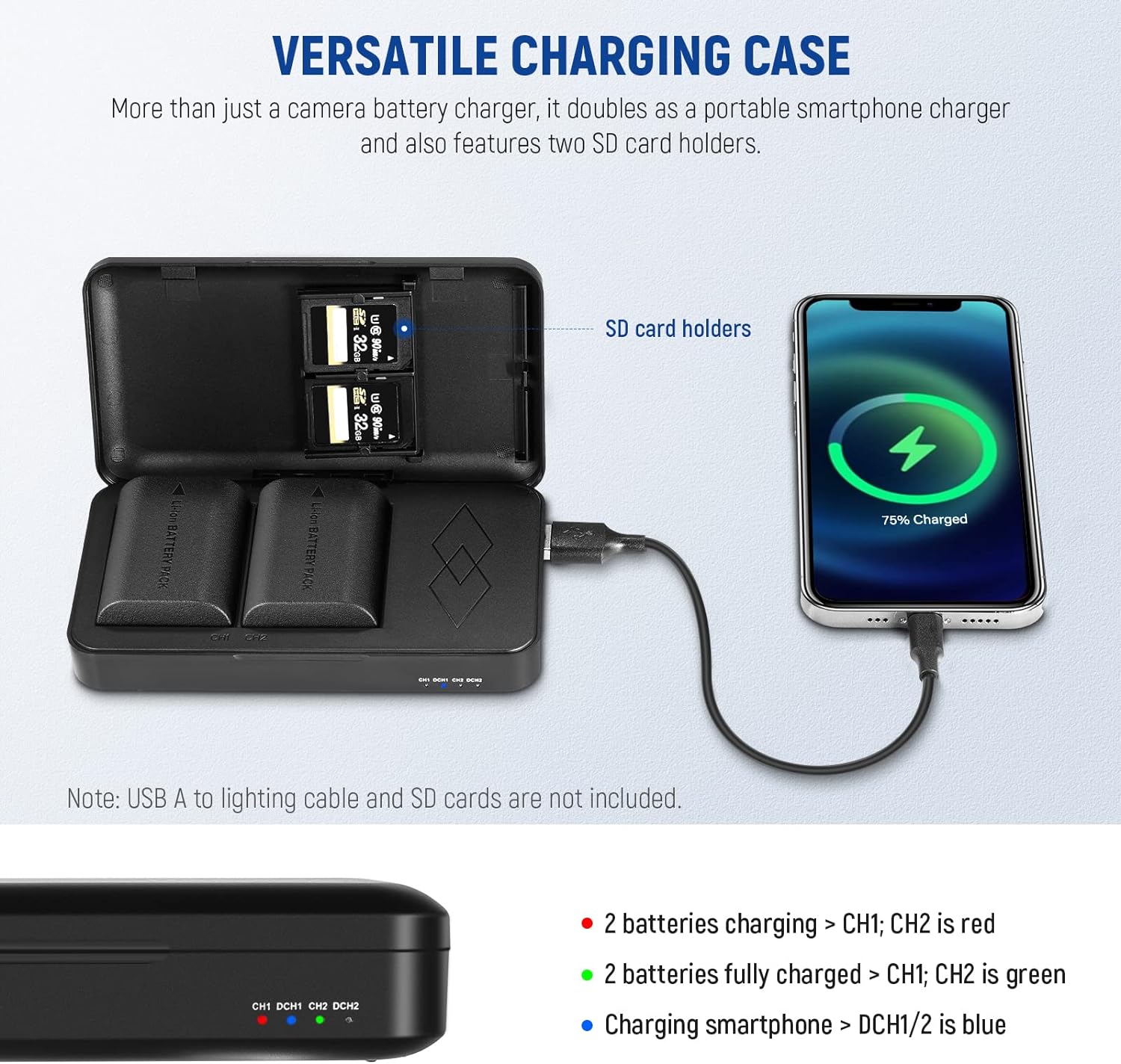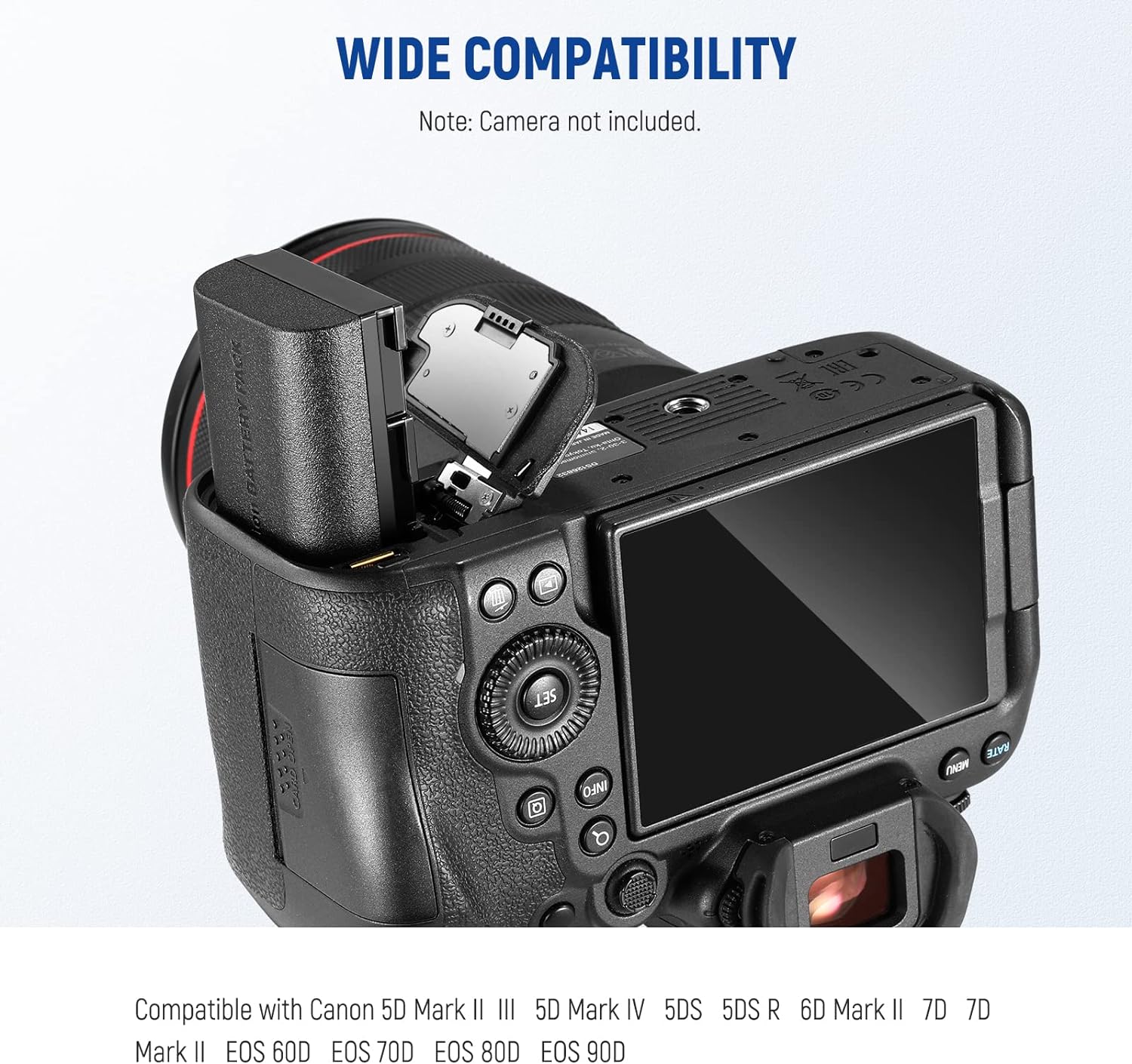 The NEEWER LP-E6/E6N Replacement Battery and USB Dual Charging Case Set is the perfect companion for your Canon camera. This set includes two 2000mAh batteries and a versatile charging case that not only charges your batteries but also protects them and can even charge your smartphone on the go. **Specifications:** * **Batteries Included:** 2 x 2000mAh LP-E6/E6N replacement batteries * **Charging Ports:** Micro USB, USB Type-C (input), USB Type-A (output) * **Compatibility:** Canon 5D Mark II/III/IV, 5DS/5DS R, 6D Mark II, 7D/7D Mark II, 60D, 70D, 80D, 90D * **Charging Time:** Approximately 2 hours per battery * **Protection Features:** Overcharge, overheat, overcurrent, overvoltage, electric shock, short circuit protection * **Additional Features:** SD card holders, portable smartphone charging capability * **Dimensions:** 6.57 x 5.39 x 1.42 inches * **Weight:** 10 ouncesWe partner with Amazon and other retailers to provide accurate product information and convenient access to purchase options. As an Amazon Associate we earn from qualifying purchases.