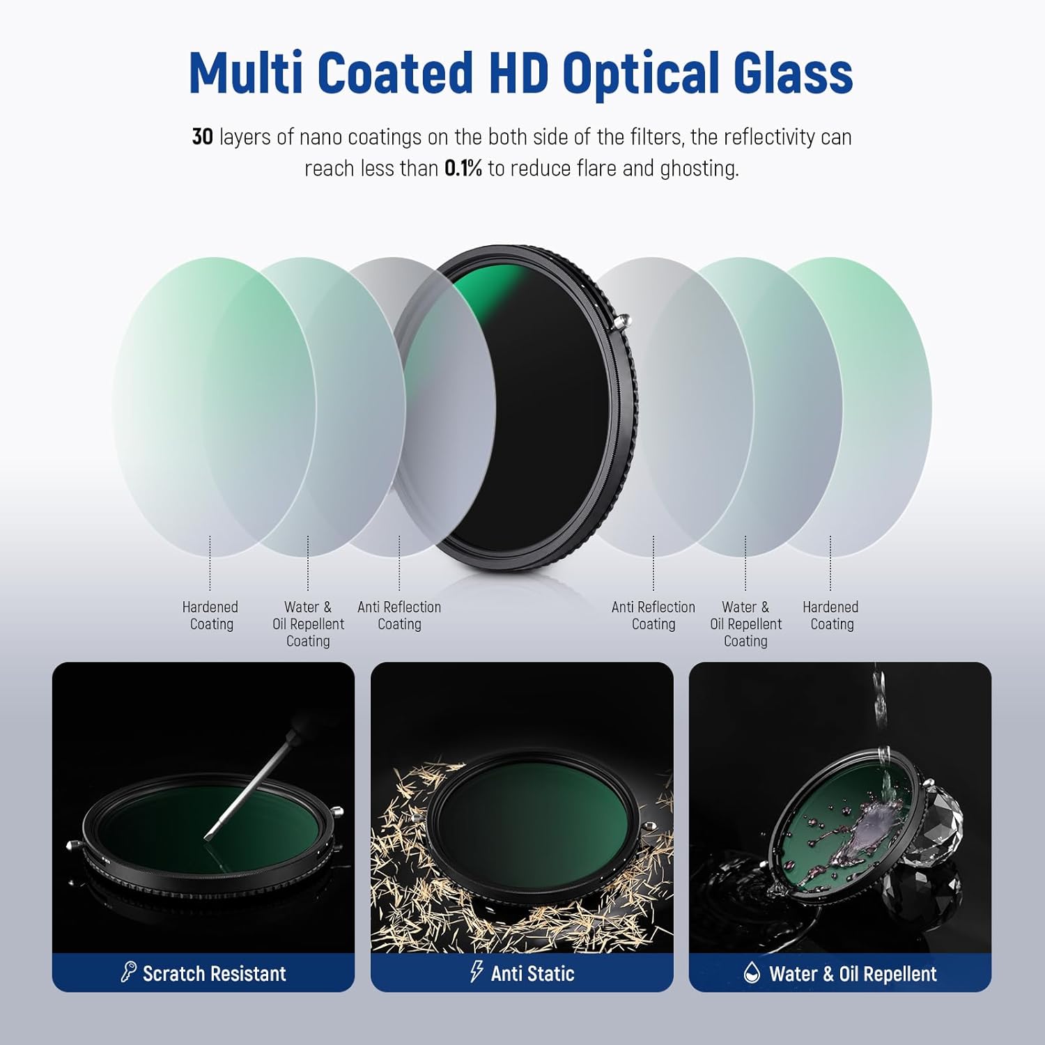 The NEEWER 2-in-1 82mm Variable ND Filter and CPL Filter offers exceptional versatility for photographers and videographers. This filter combines the functionality of a variable neutral density filter and a circular polarizer, allowing you to control both light intensity and reflections. Made with high-definition optical glass and featuring multiple resistant coatings, this filter delivers stunning image quality while protecting your lens.