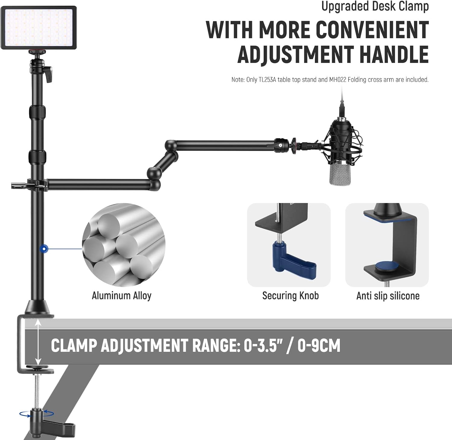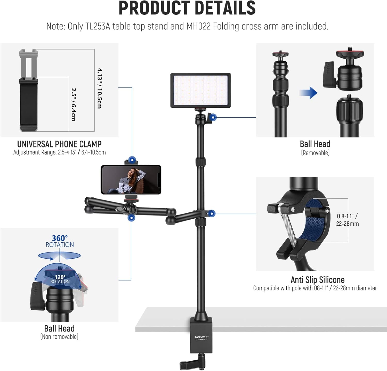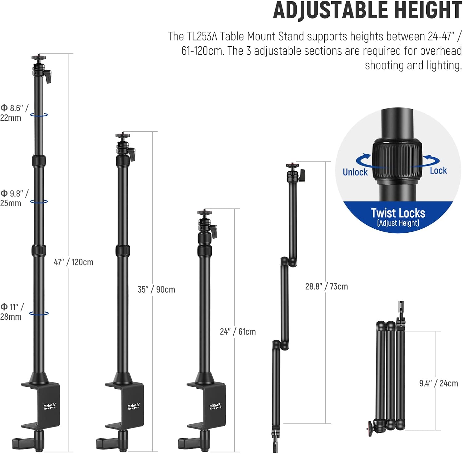 The NEEWER Improved Table Camera Mount Stand offers flexibility and stability for overhead shots, live streaming, and video recording. With adjustable height and a flexible arm, it's perfect for various devices including cameras, phones, and lights.