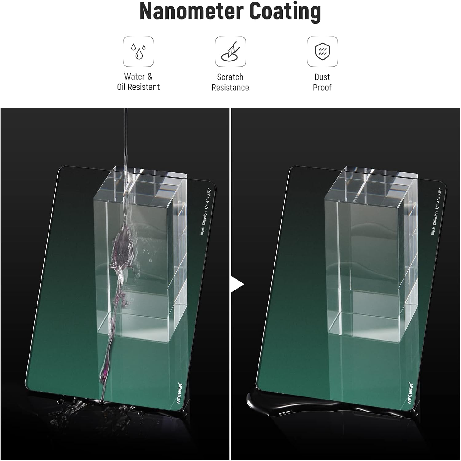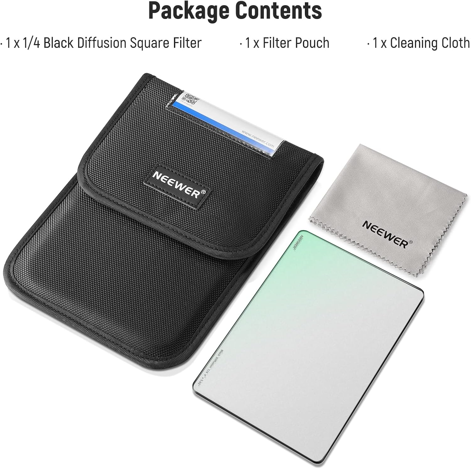 The NEEWER 1/4 Black Diffusion Mist Cinema Square Filter delivers a soft, cinematic effect for professional photo and video. Compatible with matte boxes, this filter reduces highlights and glare while providing excellent protection for your lens.