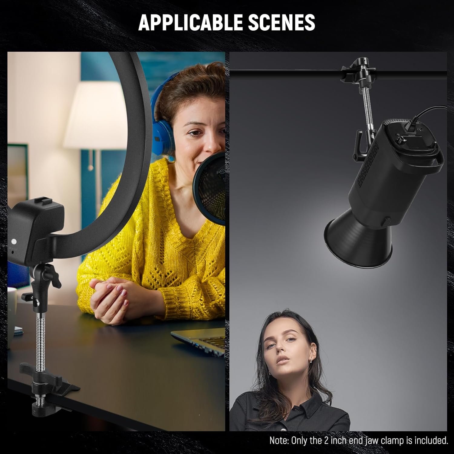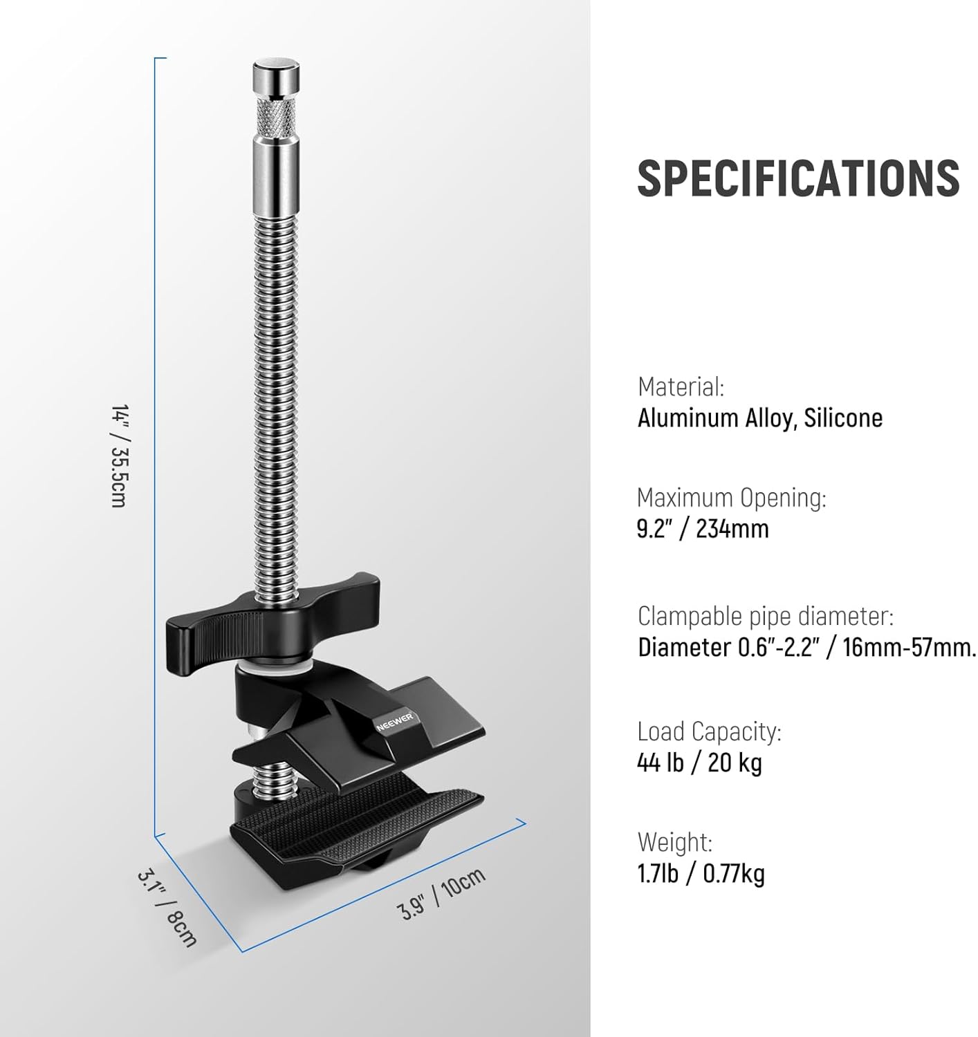 The NEEWER 9" End Jaw Grip is a versatile clamp designed to securely mount lighting fixtures and accessories. With its adjustable jaws, sturdy construction, and non-slip pads, it provides a reliable mounting solution for various supports.