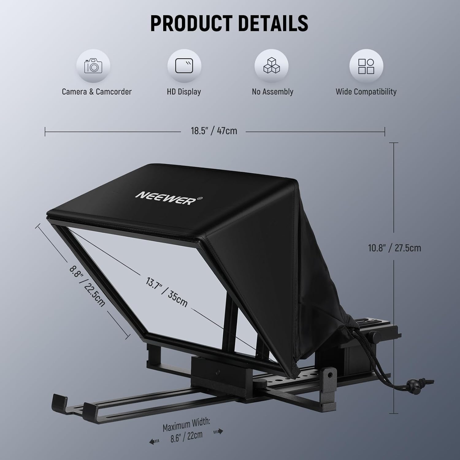 The NEEWER Teleprompter X14 II redefines convenience for video recording. Arriving fully assembled, this 14" teleprompter is designed for instant use in online courses, speeches, or news broadcasts. Featuring a quick-release camera mount and intelligent app control, it ensures smooth, professional deliveries every time.