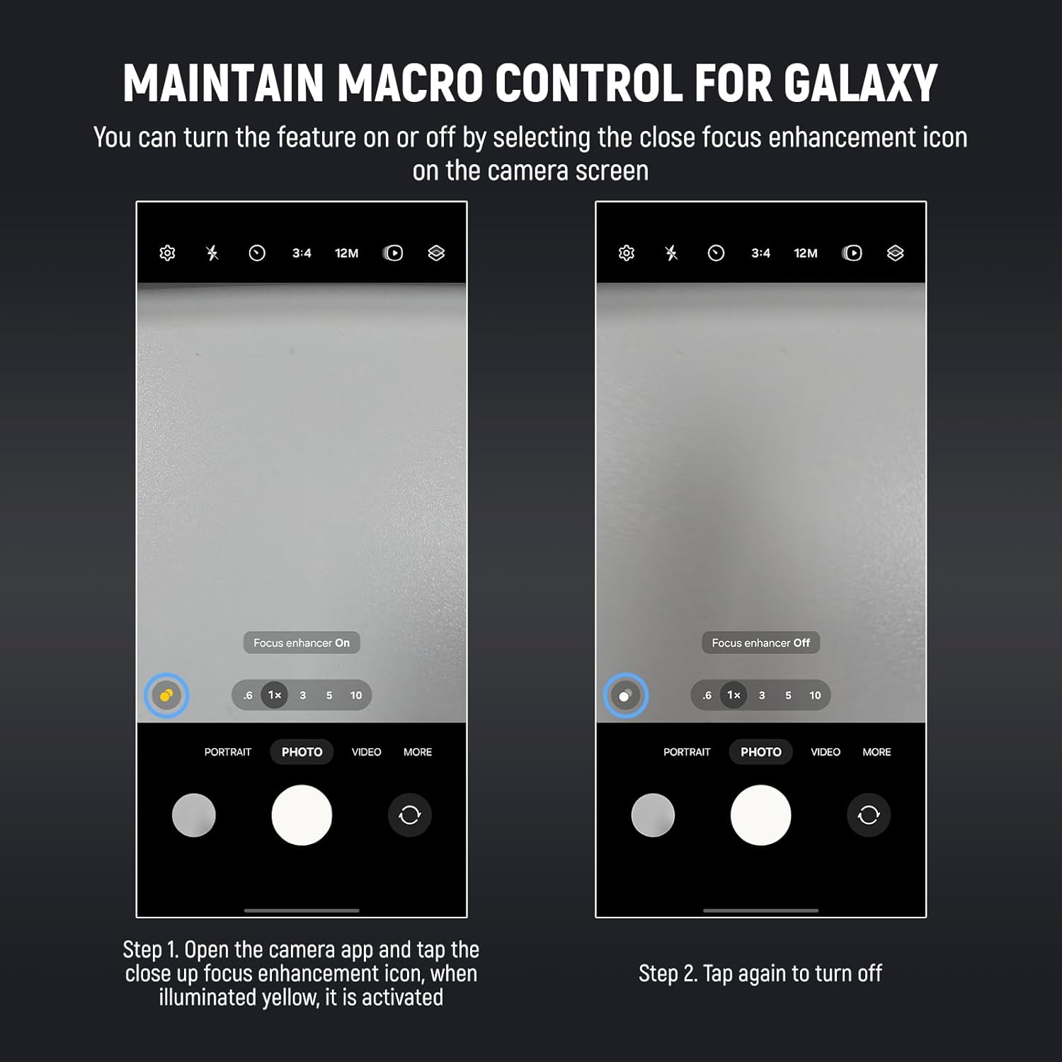 - Compatibility: Compatible with iPhone 15 Pro Max, 14 Pro Max, 13 Pro Max, 13 Mini, Xr, X, XS Max (except wide angle; disable macro). Also compatible with Samsung Galaxy S23 Ultra and S22 (disable focus enhancement).