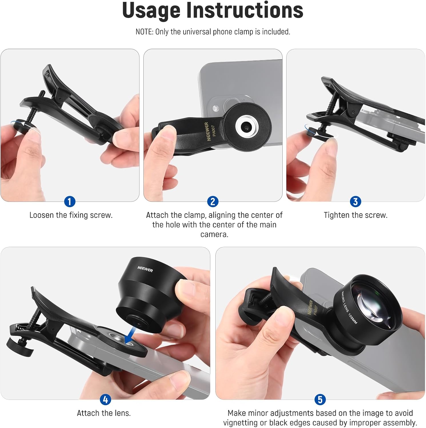 The NEEWER Universal Phone Clamp is a versatile tool designed to attach 17mm threaded lenses to your smartphone. It provides a stable and reliable mounting solution for professional and hobbyist photography, ensuring high-quality images with ease.