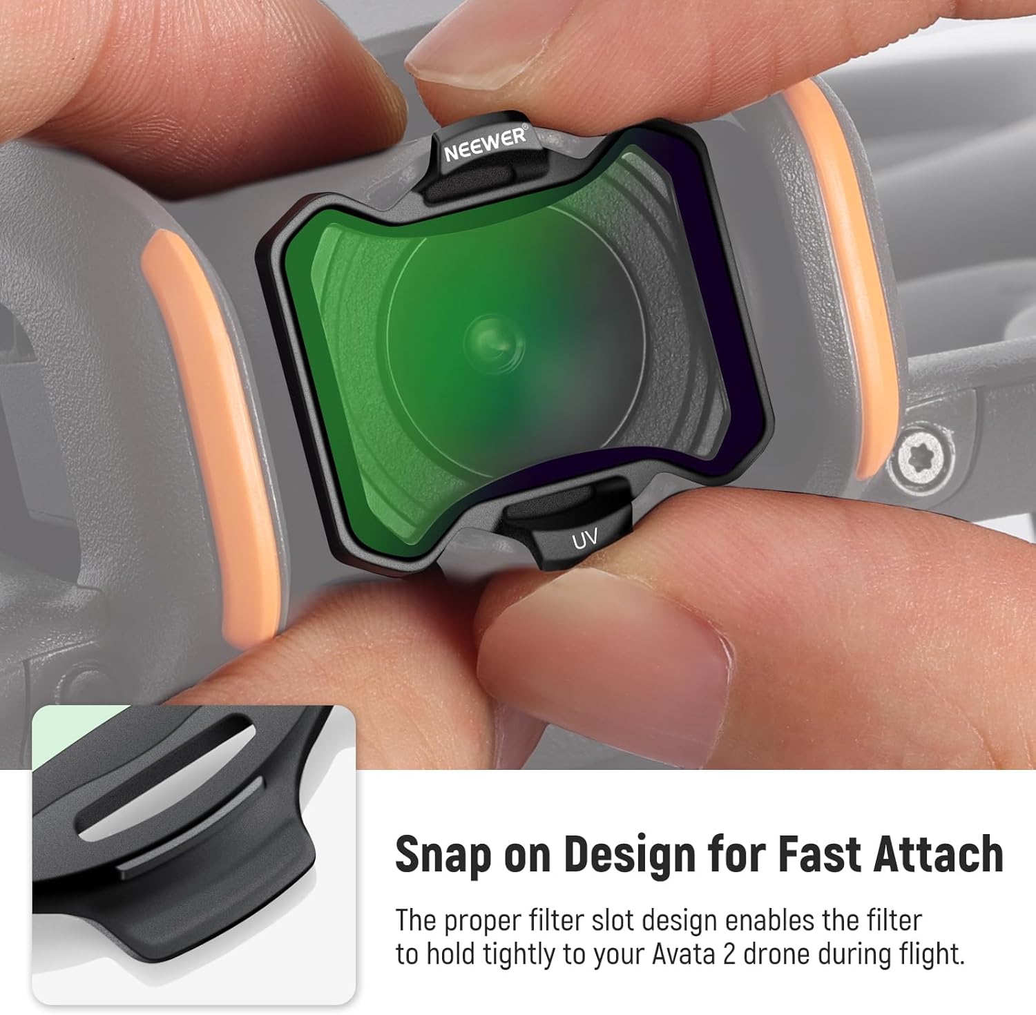 The NEEWER Snap On ND&UV&CPL Filter Set is designed to enhance your DJI Avata 2 drone photography with balanced exposure and vivid colors.