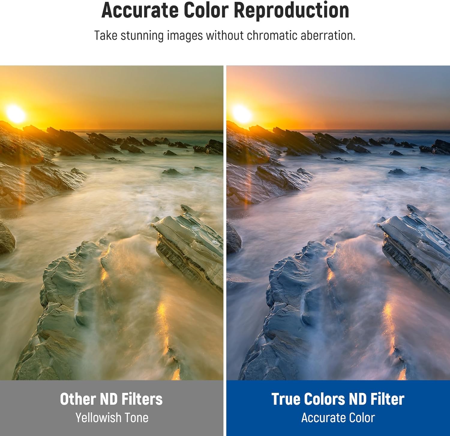 The NEEWER HD True Colors 82mm Variable ND Filter Kit offers photographers and videographers ultimate control over exposure and depth of field. Including a VND filter (ND2-512) and a magnetic ND32 filter, this kit ensures high-quality imaging with true color reproduction, eliminating color shifts and vignetting.