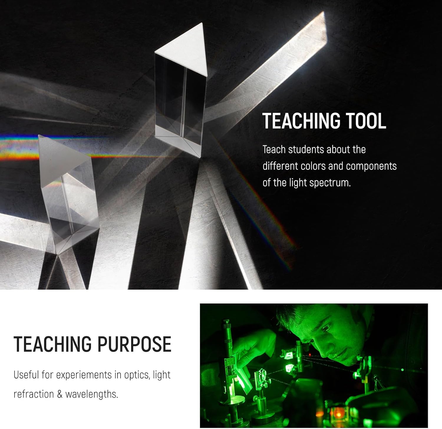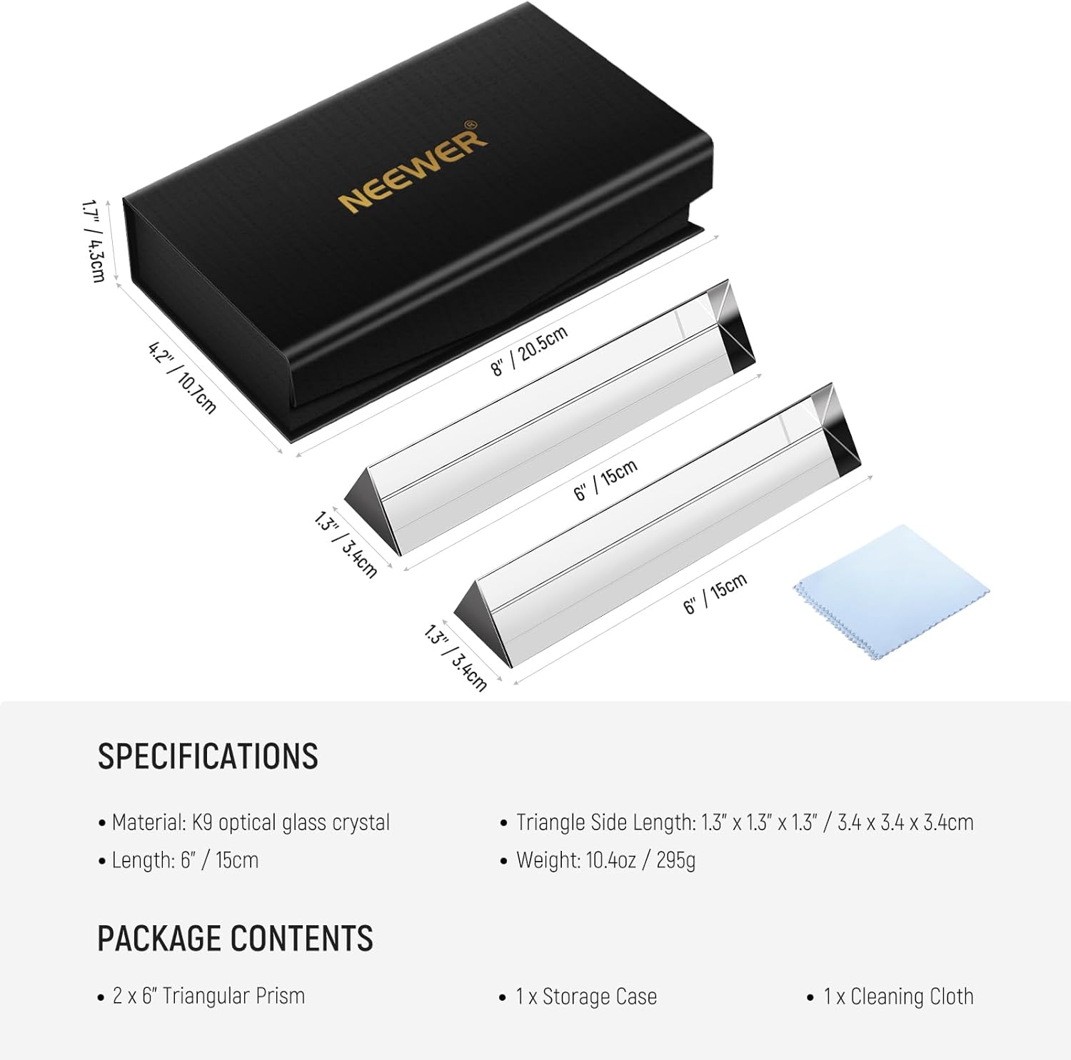 The NEEWER 2 Pack 6 Inch Triangular Prism Set is crafted from high-quality K9 crystal optical glass, perfect for prism photography and teaching light spectrum physics. Create beautiful rainbow effects and add a creative touch to your photoshoots.