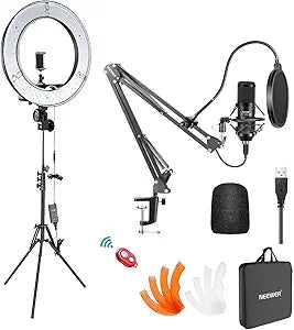 The Neewer Live Streaming Studio Kit combines a high-output LED ring light with a studio-grade condenser microphone. This all-in-one solution ensures optimal lighting and crystal-clear audio capture, perfect for content creators, gamers, and online professionals.