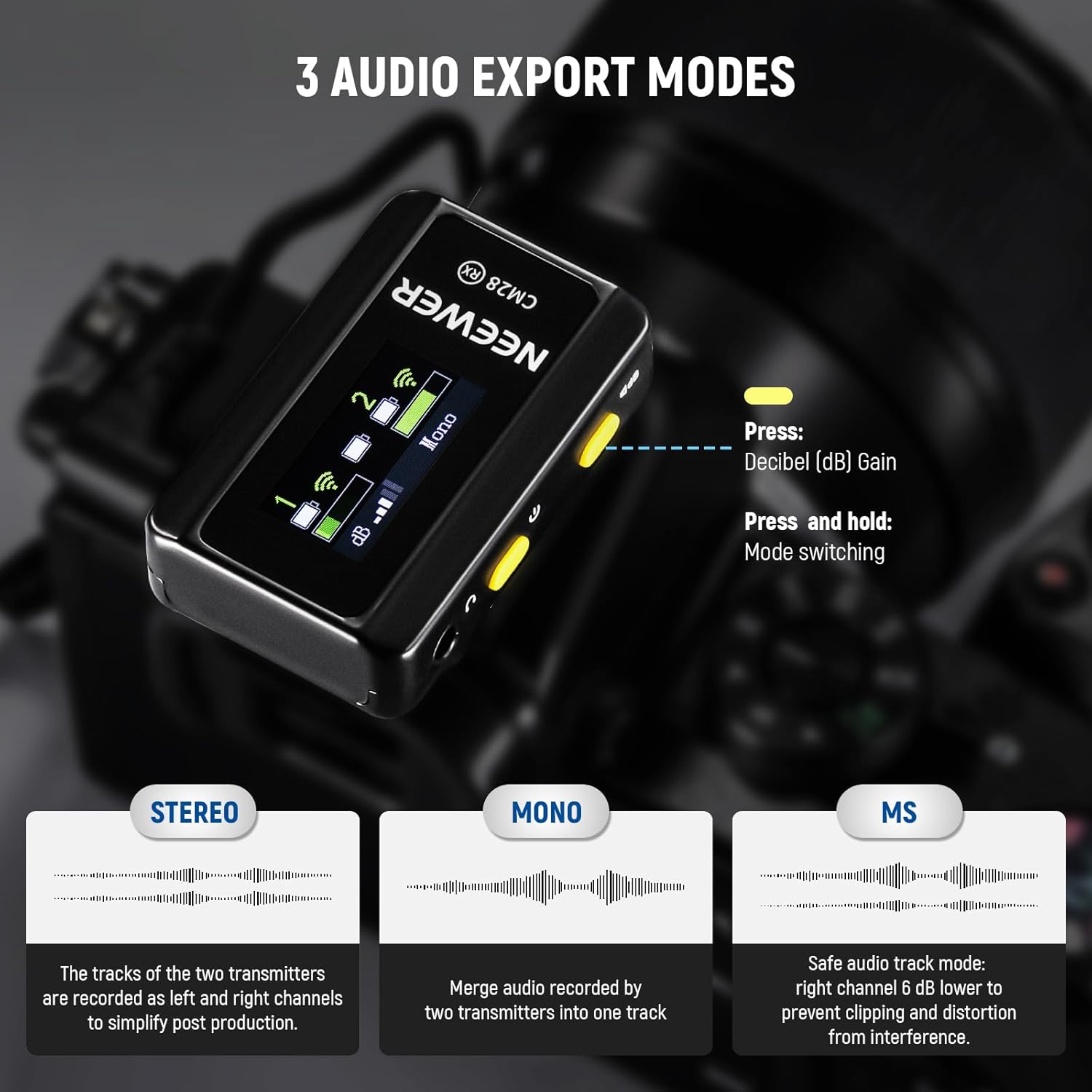 The Neewer CM28 Wireless Lavalier Microphone System offers professional-grade audio recording for smartphones, PCs, cameras, and iPads. With features like one-click noise canceling, 4GB storage, and long battery life, this system is perfect for interviews, vlogging, and live streaming.