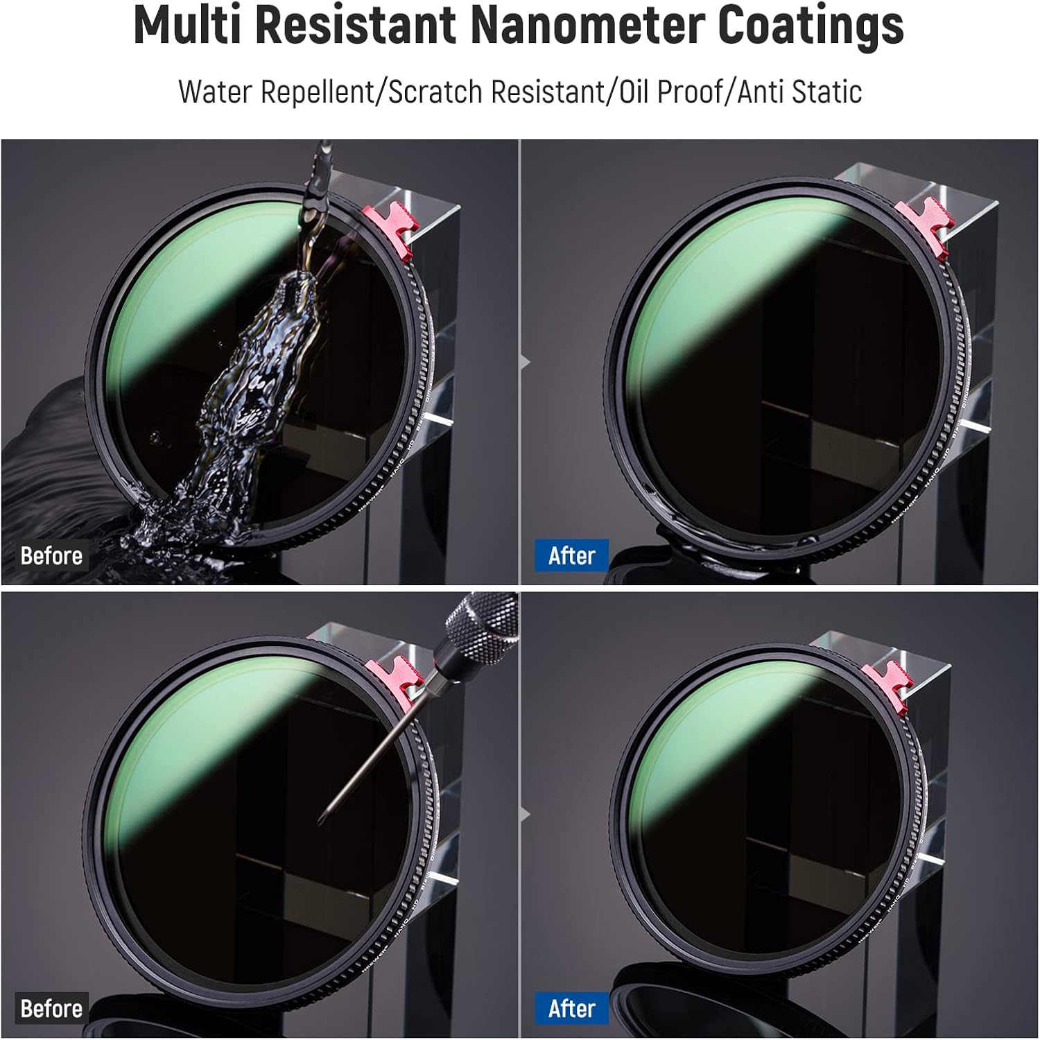 Introducing the Neewer 82mm Black Diffusion 1/4 Filter with Variable ND2-ND32. This 2-in-1 filter combines a black diffusion effect for a soft, hazy aesthetic with a variable neutral density filter, offering exceptional versatility for outdoor shooting in bright conditions.