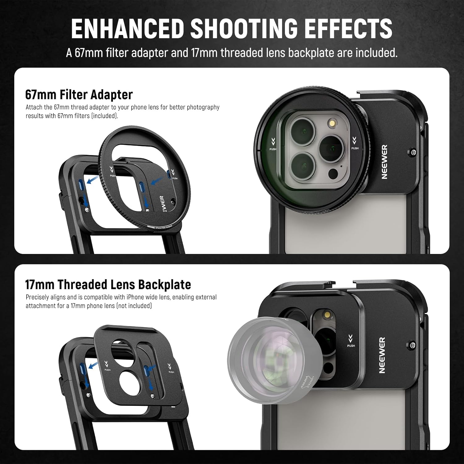 The NEEWER Pro Max Phone Cage is designed to transform your iPhone into a professional video recording setup. This form-fitting aluminum alloy cage provides robust protection against scratches and impacts, while maintaining a slim profile. It features a 67mm black diffusion filter, a snap-on filter adapter, and a 17mm threaded lens backplane for expanded creative options. With multiple mounting points, it's perfect for vlogging, filmmaking, and live streaming.