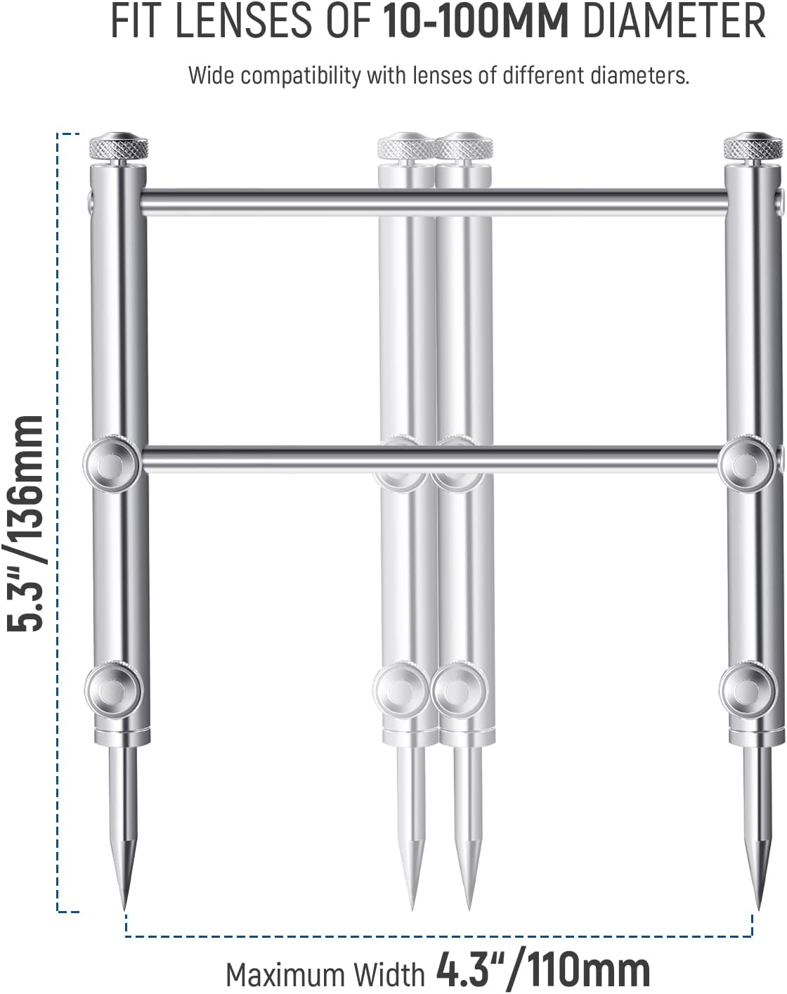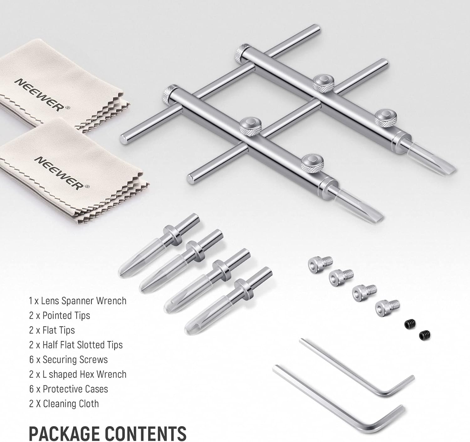 - Includes: Lens spanner wrench, two sets of tips, two L shaped hex keys, six thumb screws, six hex screws (including two M4 hex screws), and two lens cleaning cloths