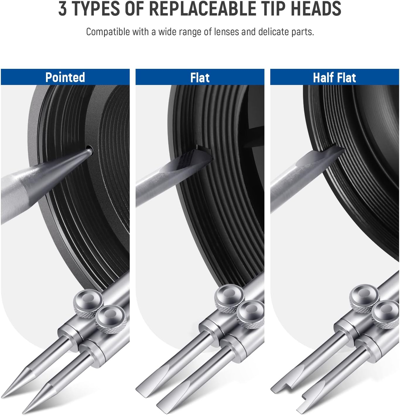 The NEEWER Stainless Steel Lens Spanner Wrench is a professional-grade tool designed for repairing and opening DSLR camera lenses and telescope lenses. Equipped with replaceable tips and made from high-quality stainless steel, this set ensures durability and precise adjustments.