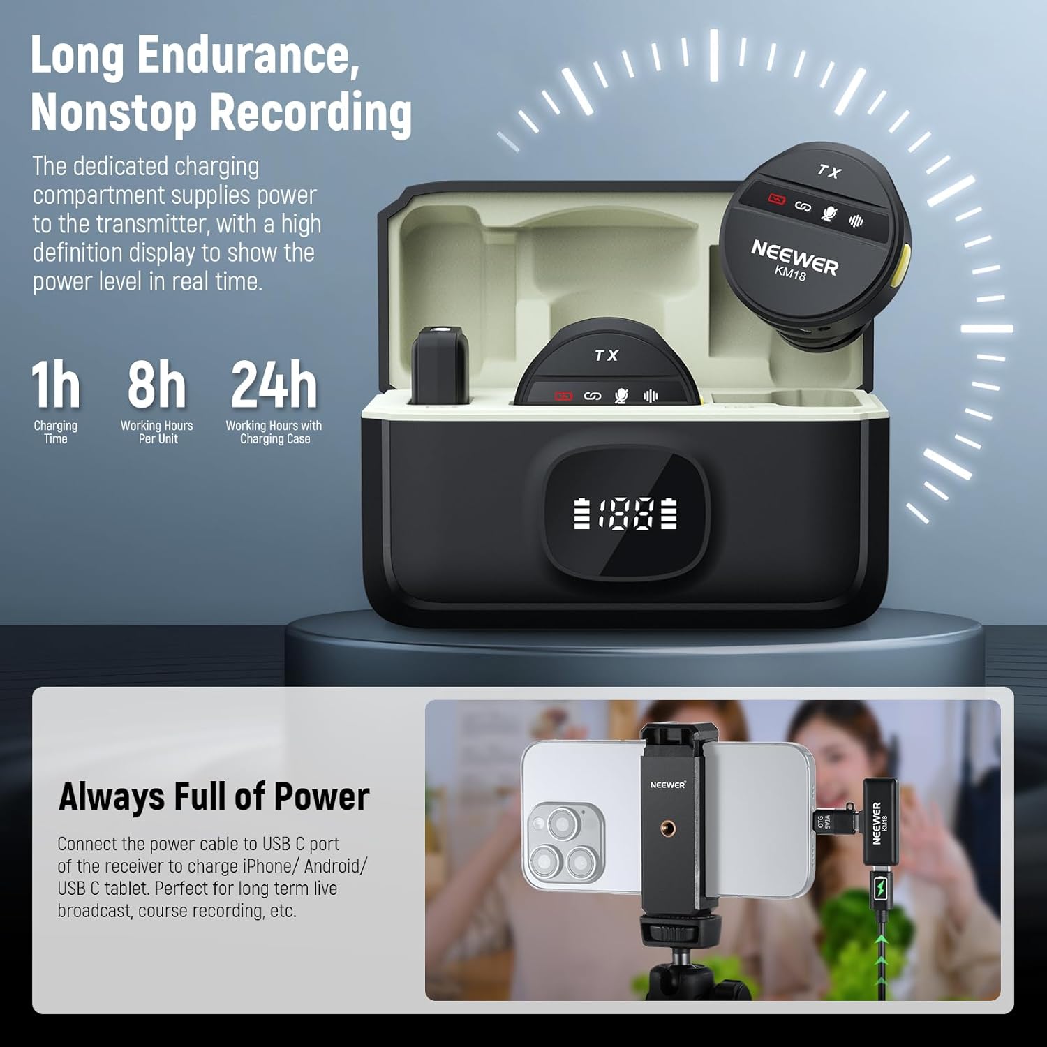 Introducing the NEEWER KM18 Wireless Lavalier Microphone System, your ultimate solution for capturing high-quality audio on the go. Designed for iPhone, Android phones, PCs, and laptops, this mini lapel mic set offers noise-cancelling capabilities, a long-lasting battery, and plug-and-play convenience for vlogging, interviews, online teaching, and more.