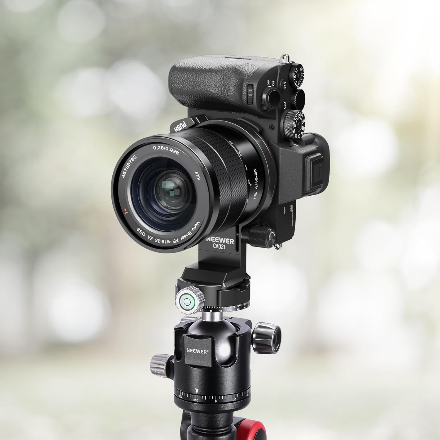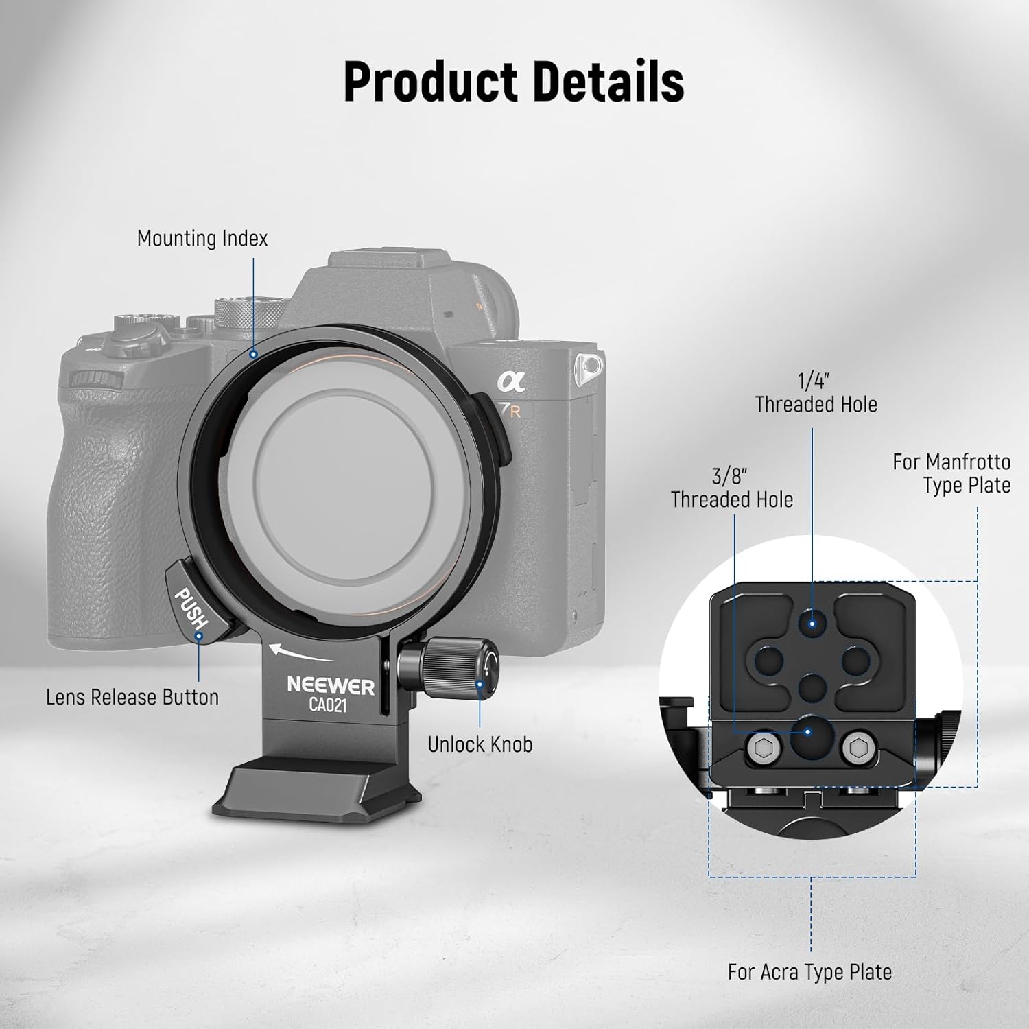 The Neewer CA021 rotatable collar mount plate is designed for Sony Alpha cameras, providing quick and easy switching between horizontal and vertical orientations. Its formfitting design and secure locking system ensure stability and accessibility to camera functions.