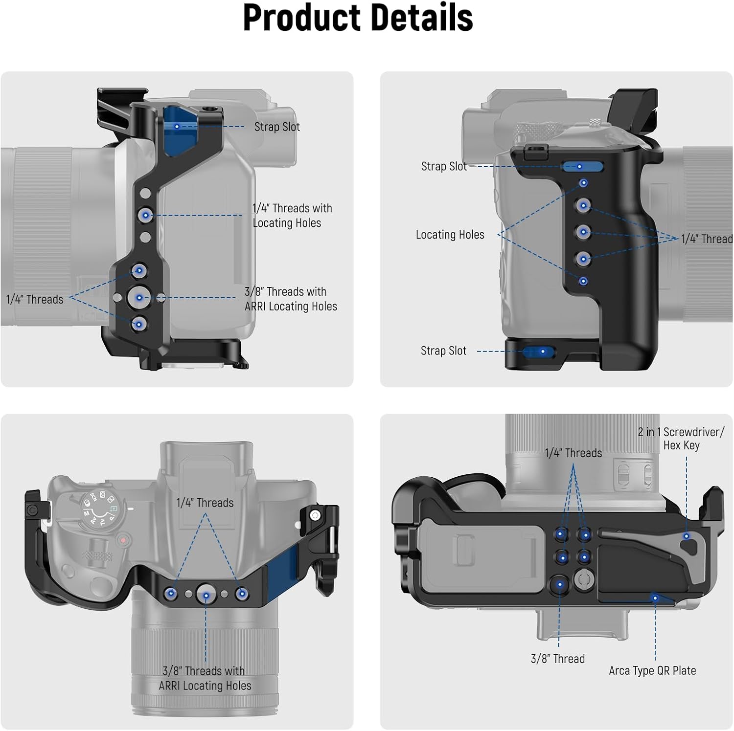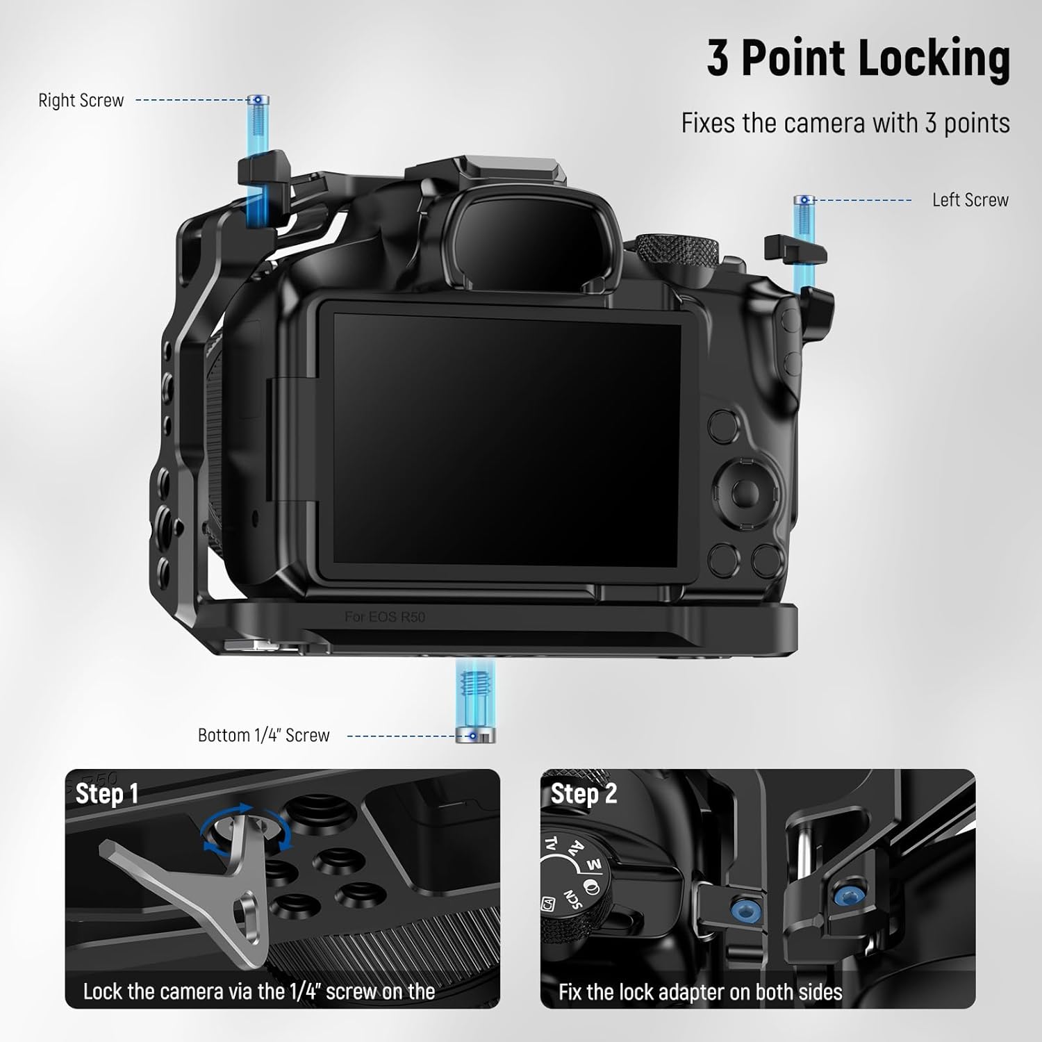 The NEEWER R50 Camera Cage provides enhanced protection and multiple mounting points for your Canon EOS R50 camera, crafted from durable aluminum alloy.
