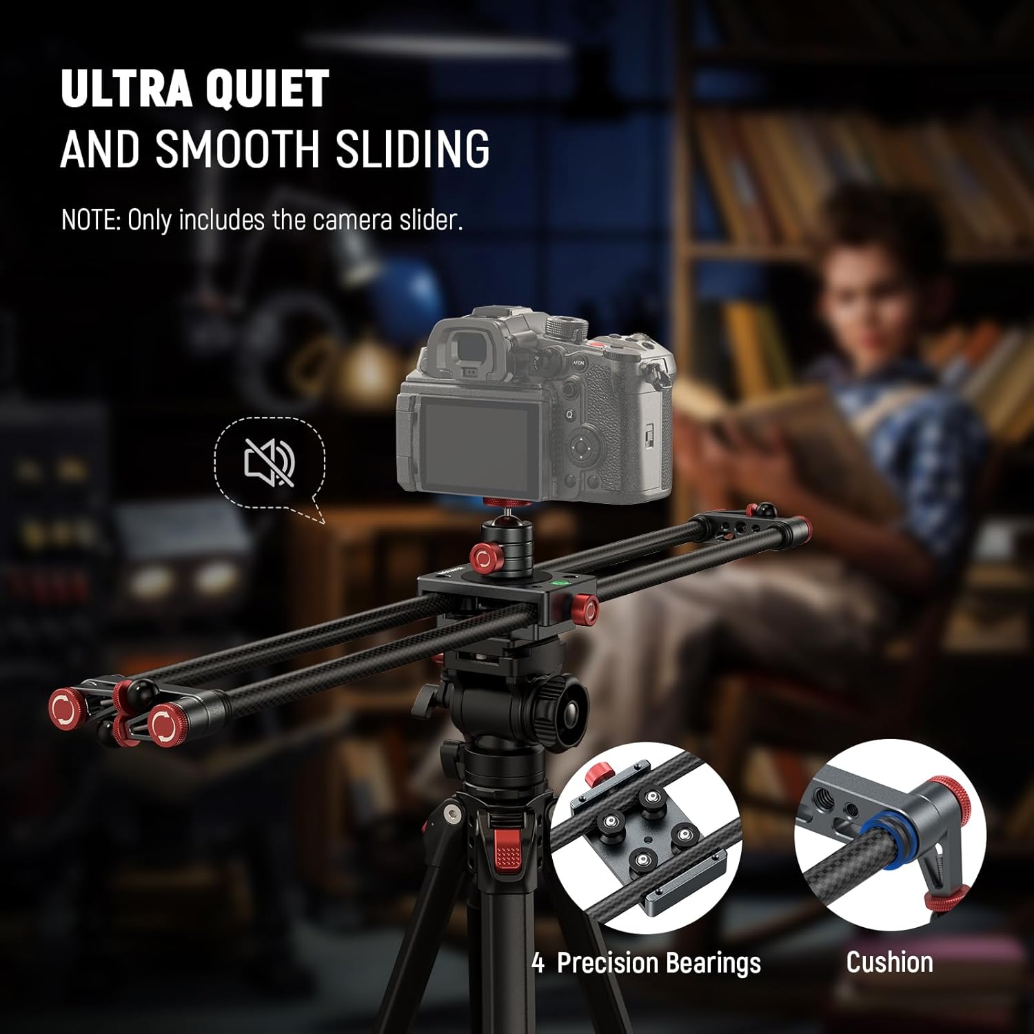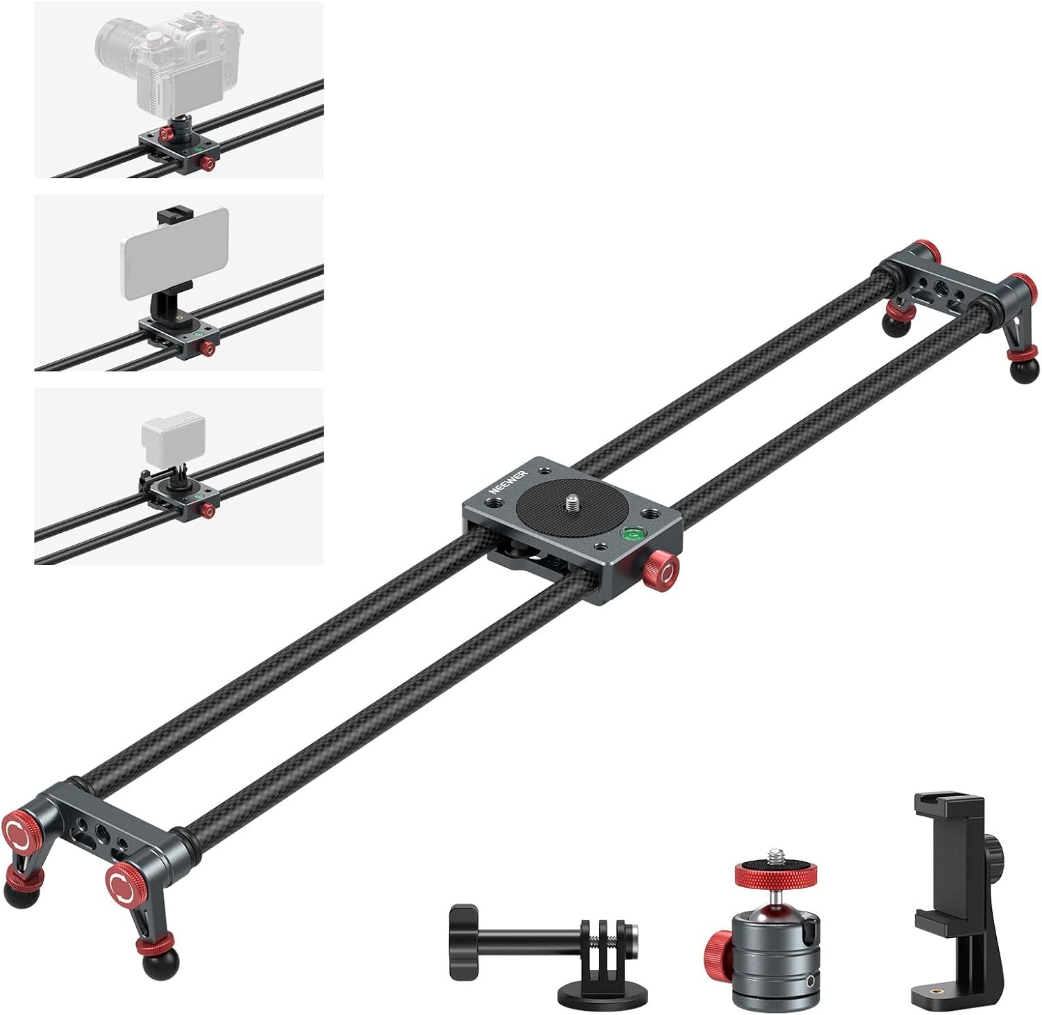 The NEEWER 24in/60cm Carbon Fiber Camera Slider is designed to provide smooth, stable camera movement for professional video and photography. Featuring adjustable legs, a 360° ball head, and versatile mounting options, this slider is perfect for a wide range of devices, from DSLRs to smartphones and action cameras.