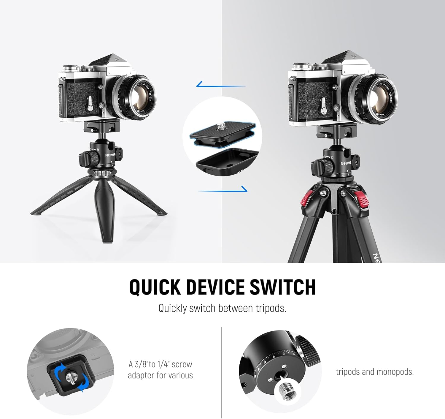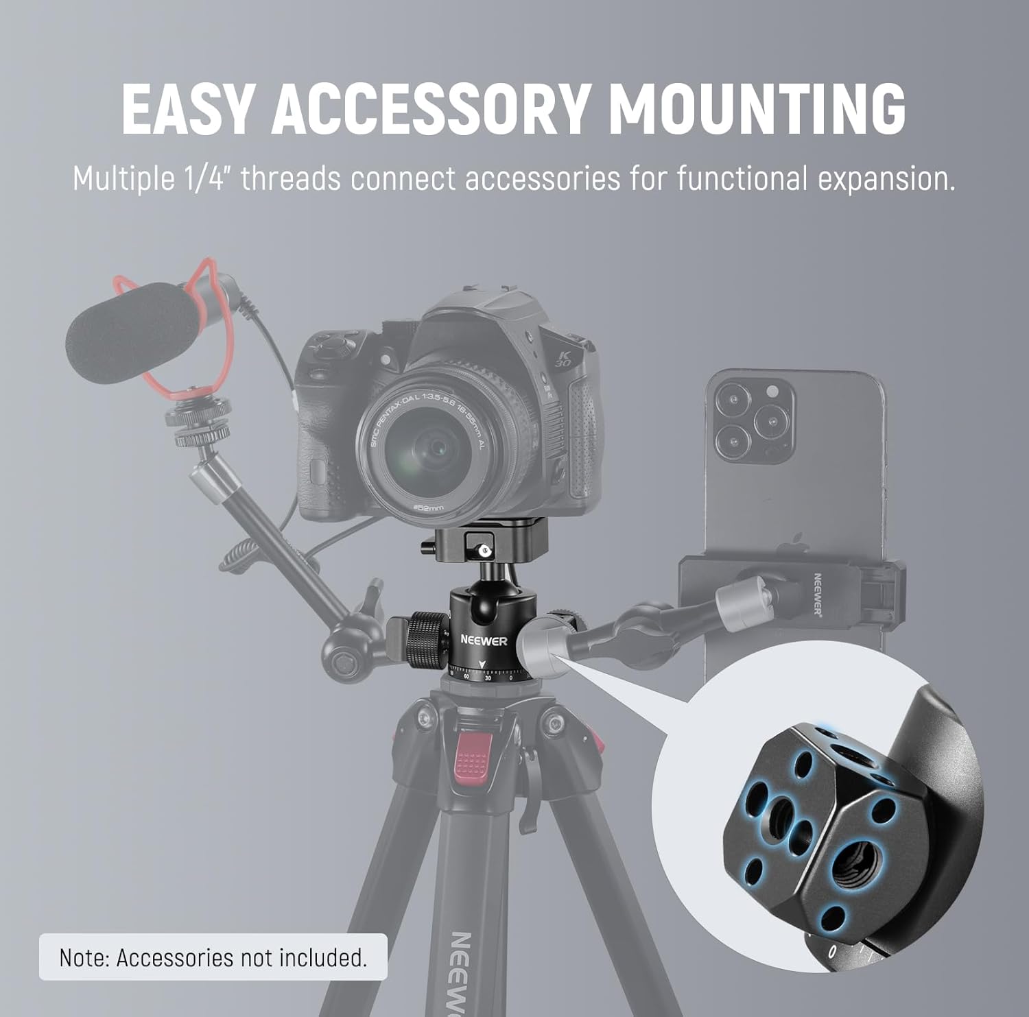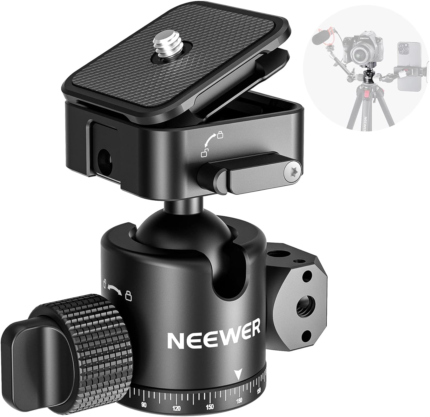 The NEEWER GM12 Ball Head offers a secure and flexible mounting solution for cameras and camcorders. Features a four-sided Arca slot quick release plate, 360° panoramic rotation, and 180° tilt adjustment.