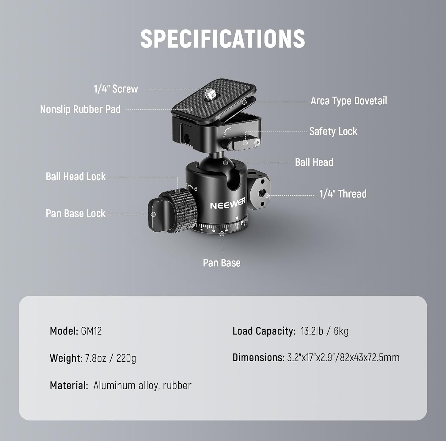 Neewer GM12 Ball Head - Arca Slot, 360° Pan, 13.2lb Load