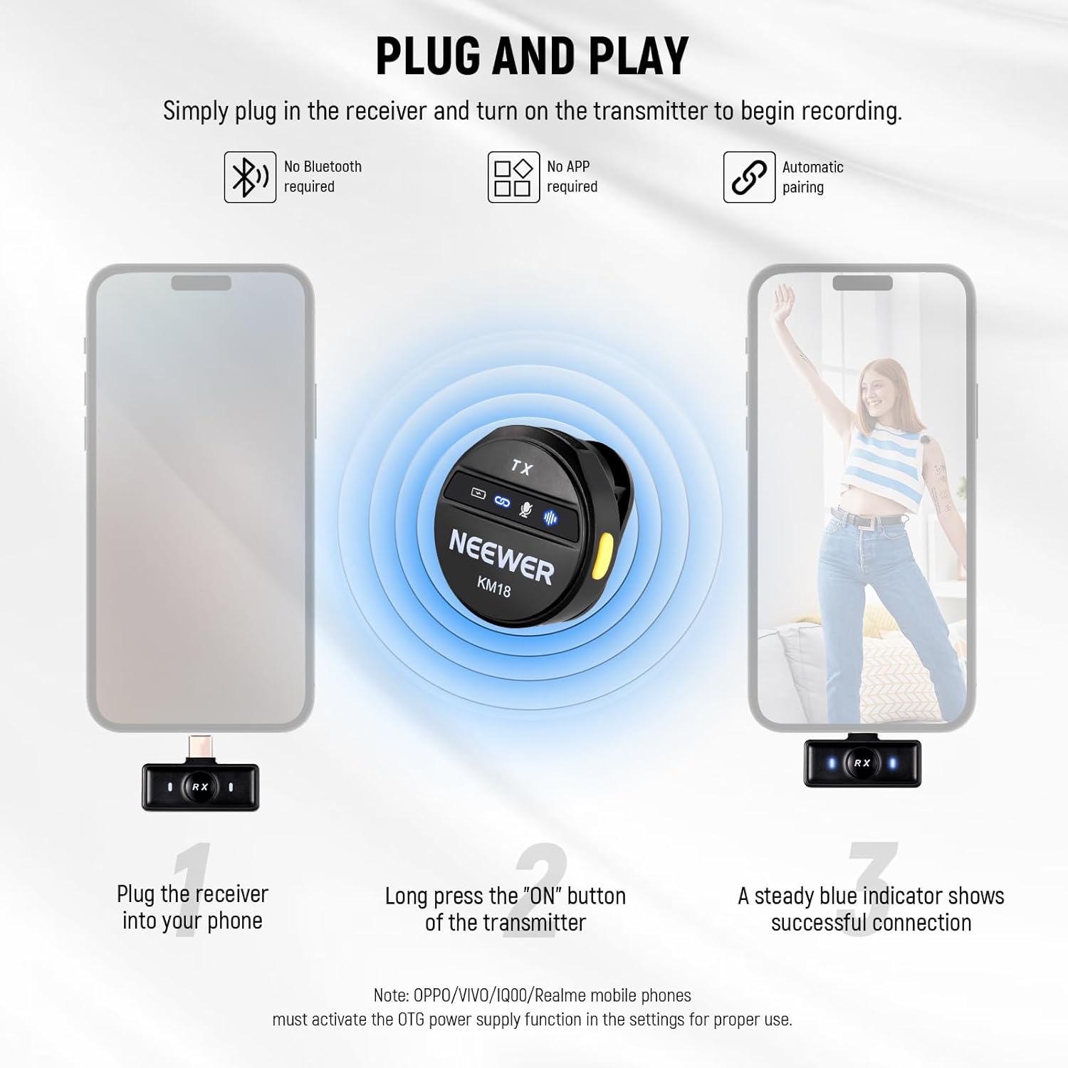 The Neewer Wireless Lavalier Microphone KM18 is designed for USB-C devices, delivering high-quality 48KHz/24Bit audio with excellent noise cancellation. Ideal for Android phones, PCs, and laptops, it ensures 24 hours of battery life for uninterrupted recording.