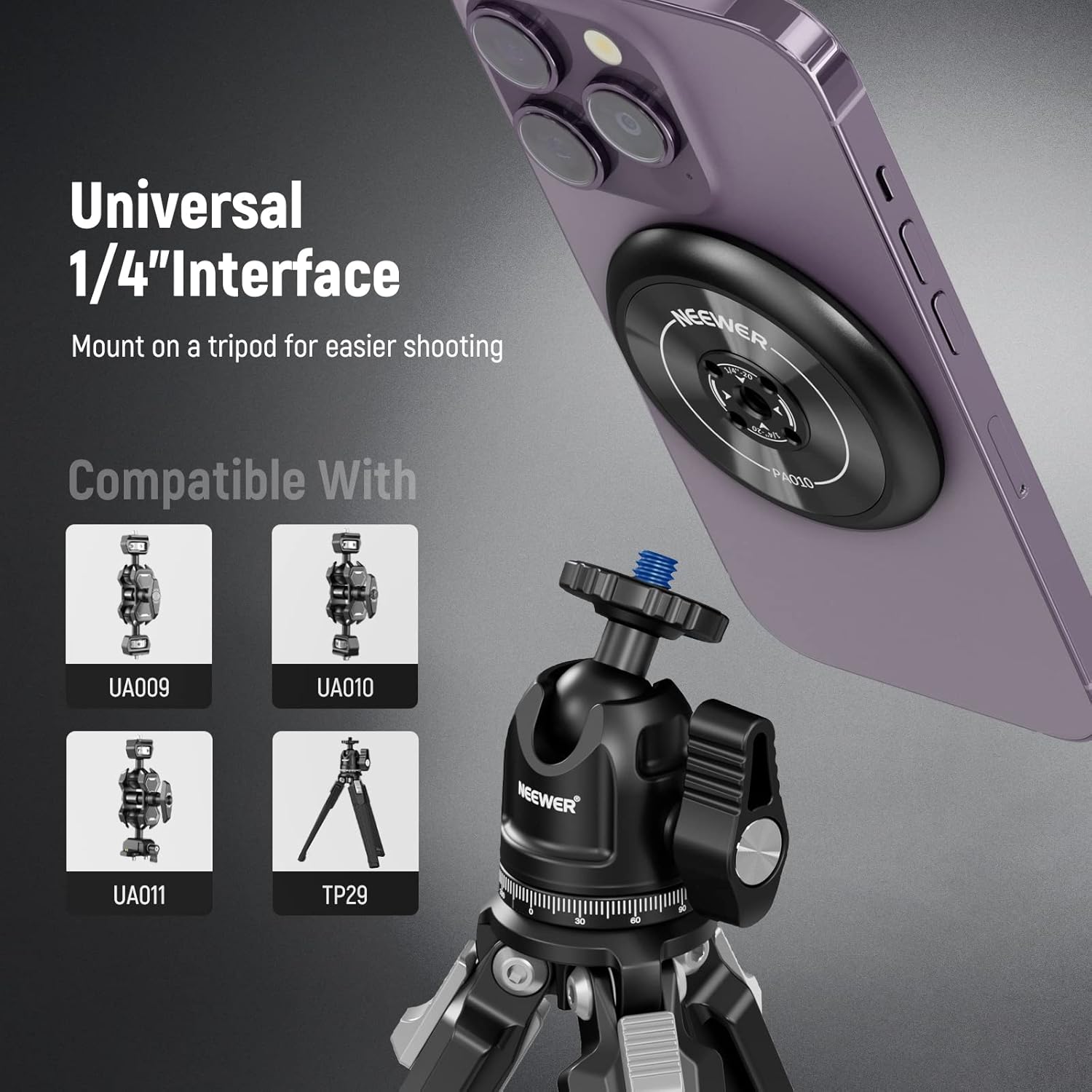 Introducing the NEEWER Magnetic Phone Tripod Mount Adapter, a versatile accessory designed to securely mount your smartphone for photography and videography. Compatible with iPhone MagSafe and other smartphones (with a magnetic case or ring), this mount offers a strong magnetic grip and seamless integration with tripods, selfie sticks, and more. Its compact design and adjustable angles make it an essential tool for capturing professional-quality content on the go.
