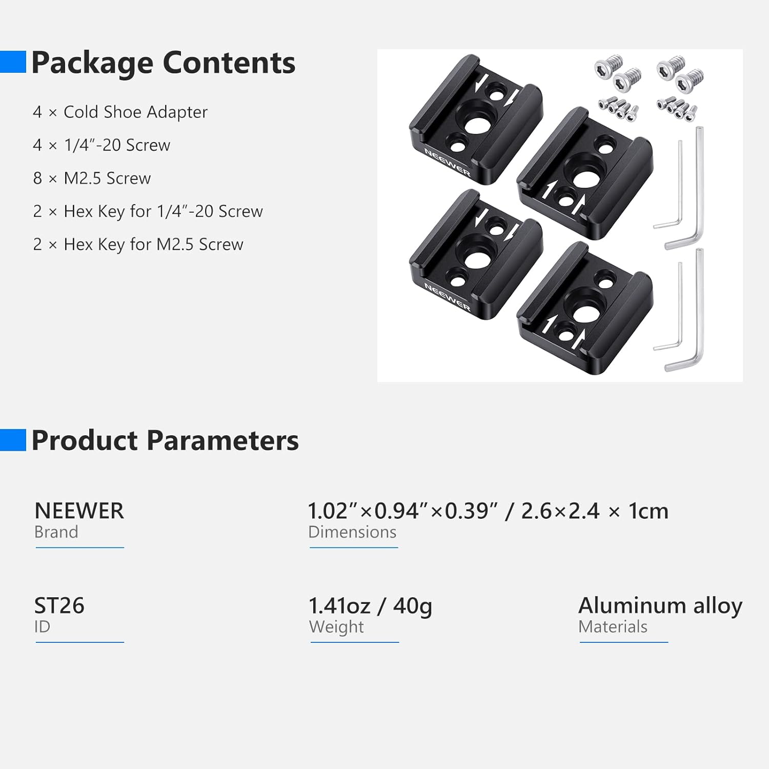 - Included: 4 x Cold Shoe Adapter, 4 x 1/4"-20 Screws, 8 x M2.5 Screws, 2 x Hex Key for 1/4"-20 Screw, 2 x Hex Key for M2.5 Screw