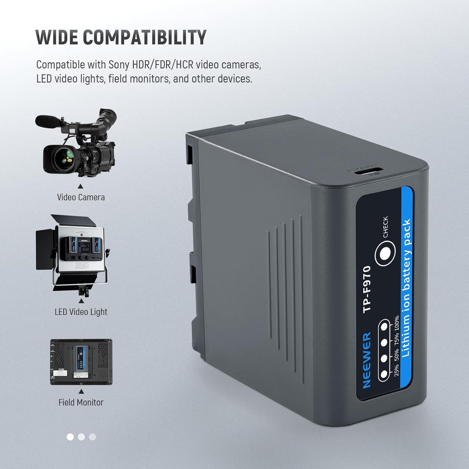 - Compatibility: NP-F series batteries (NP-F550, NP-F570, NP-F750, NP-F770, NP-F960, NP-F970, NP-F975)