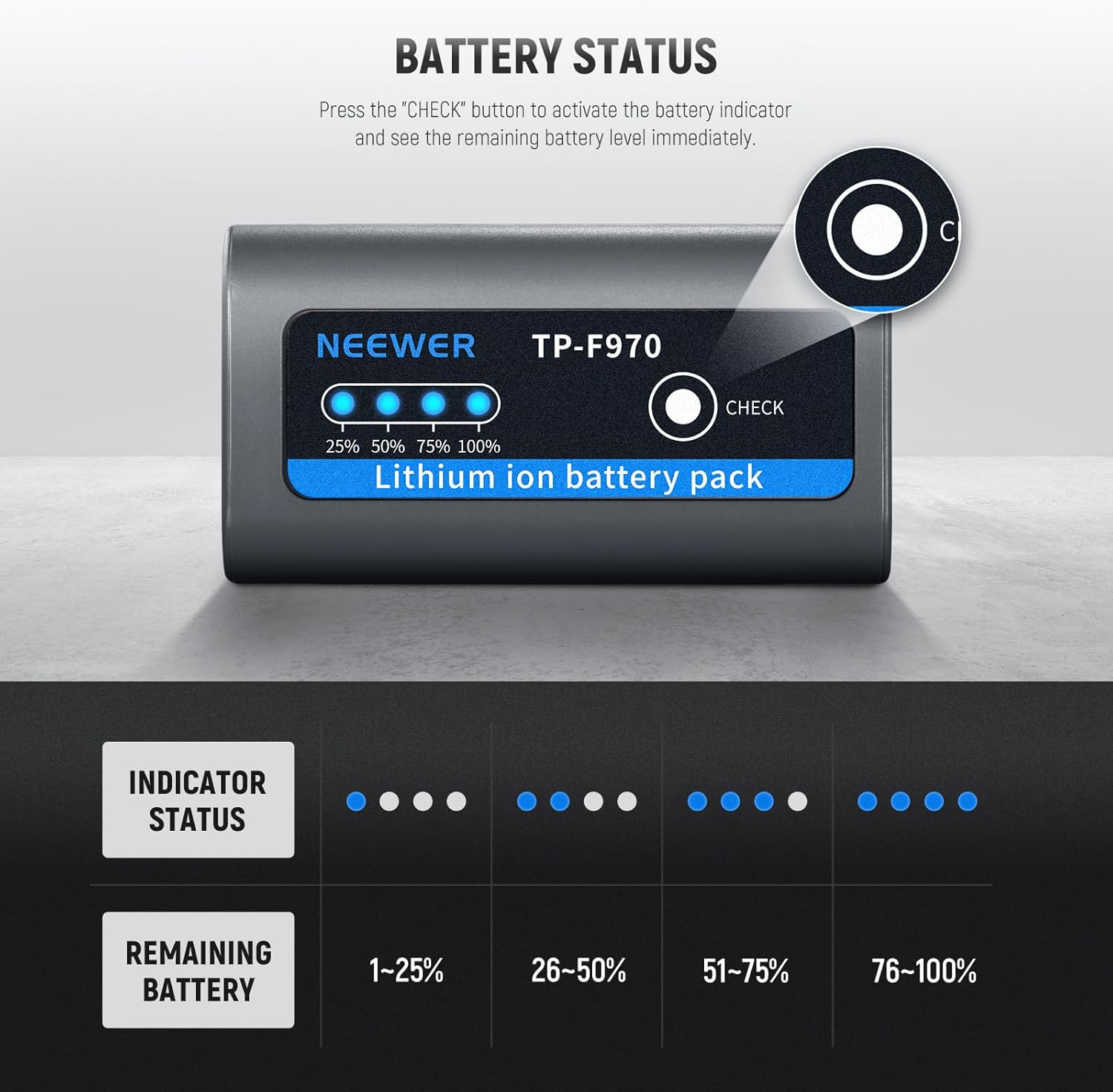 - Battery Indicators: 4 LED indicators (100%, 75%, 50%, 25%)