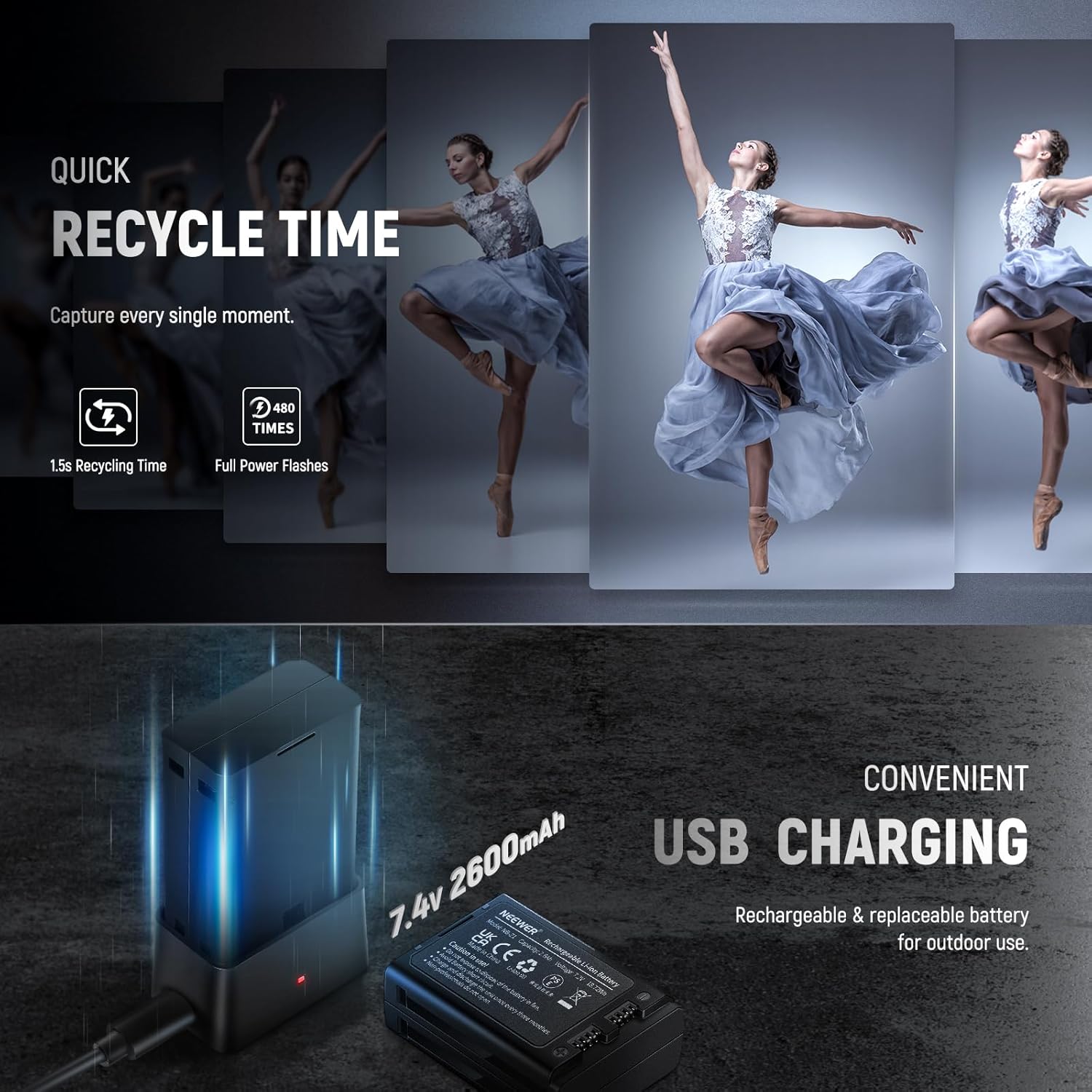 - Battery: 7.4V 2600mAh Lithium Battery (NB-Z1), 480 Full Power Flashes