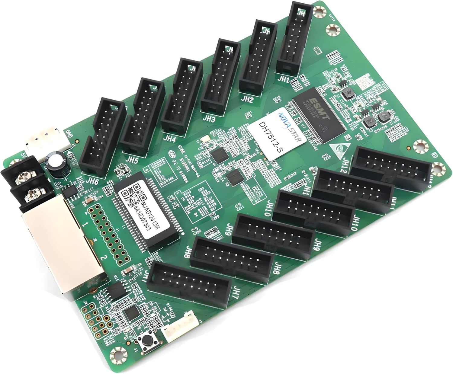 The Novastar DH7512-S LED Screen Receiving Card is a high-performance receiver card designed for NovaLCT systems, supporting up to 512x512 pixels. This card enhances display quality with features like color management, 18Bit+ technology, point-by-point brightness chroma correction, and RGB independent Gamma adjustment. With 12 standard HUB75E interfaces, the DH7512-S supports up to 24 groups of RGB parallel data, ensuring stable operation and efficient maintenance.