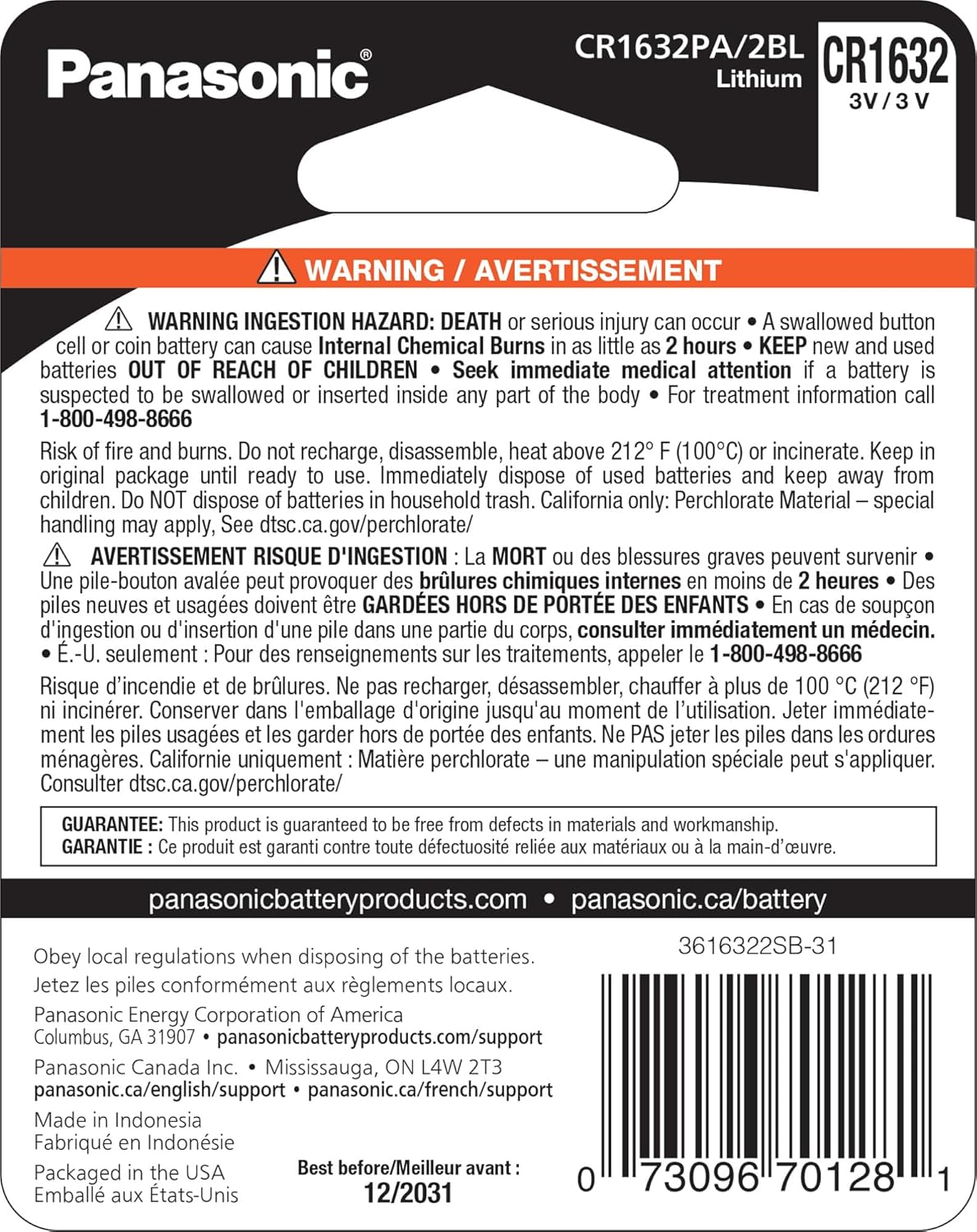 Panasonic CR1632 Lithium Coin Cell Batteries are engineered for long-lasting performance and reliability. These 3.0 volt batteries are ideal for powering small electronic devices such as car key FOBs, watches, and calculators. Packaged in child-resistant packaging to ensure safety.