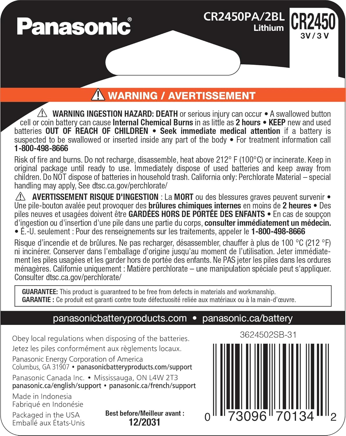Panasonic CR2450 Lithium Coin Cell Batteries provide reliable, long-lasting power for a variety of small electronic devices. Packaged with child-resistant safety features, these batteries are designed to meet high safety and performance standards.