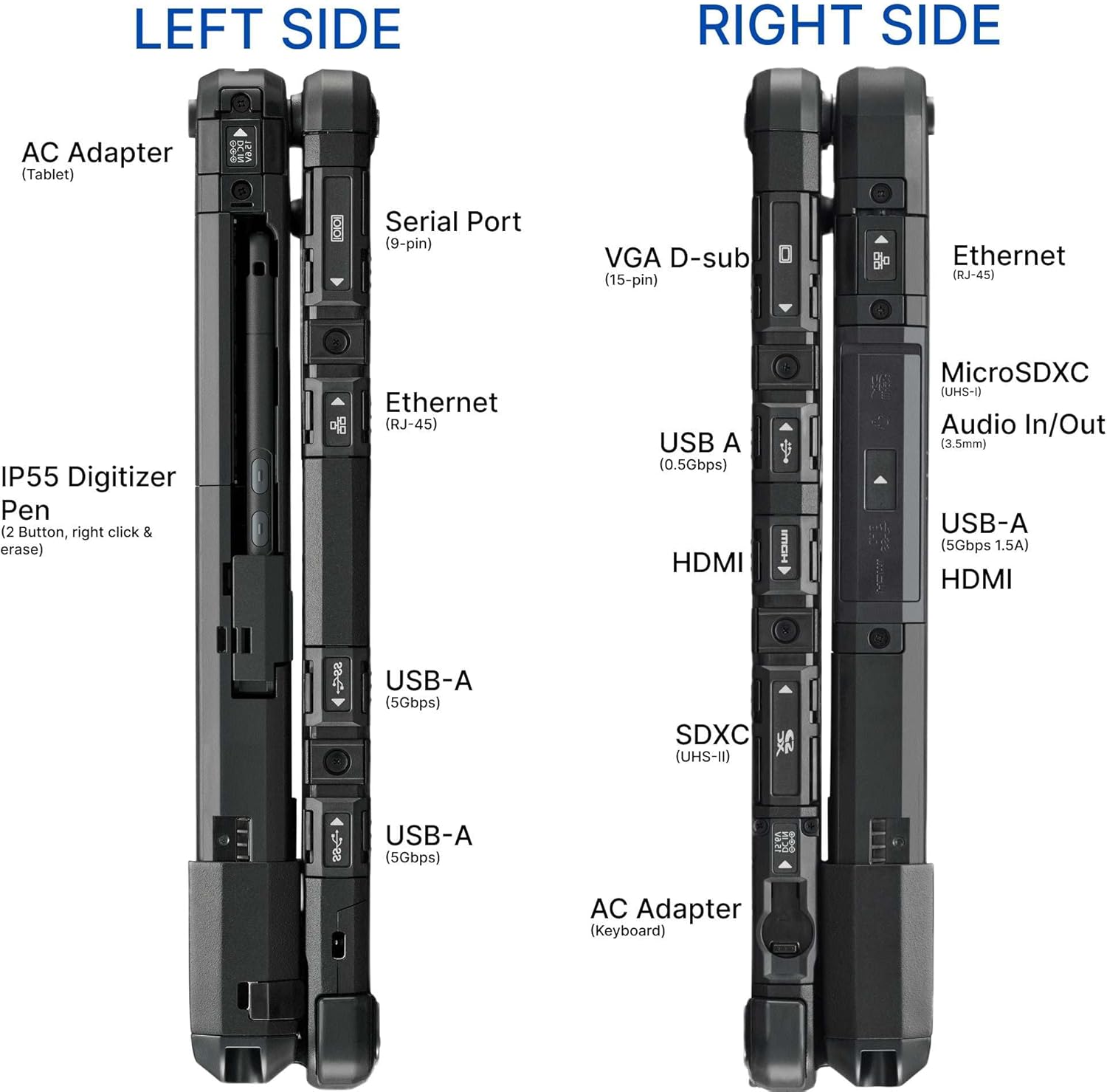 - Ports (Tablet): USB-3.0, HDMI, Nano-SIM, Ethernet, Audio In/Out