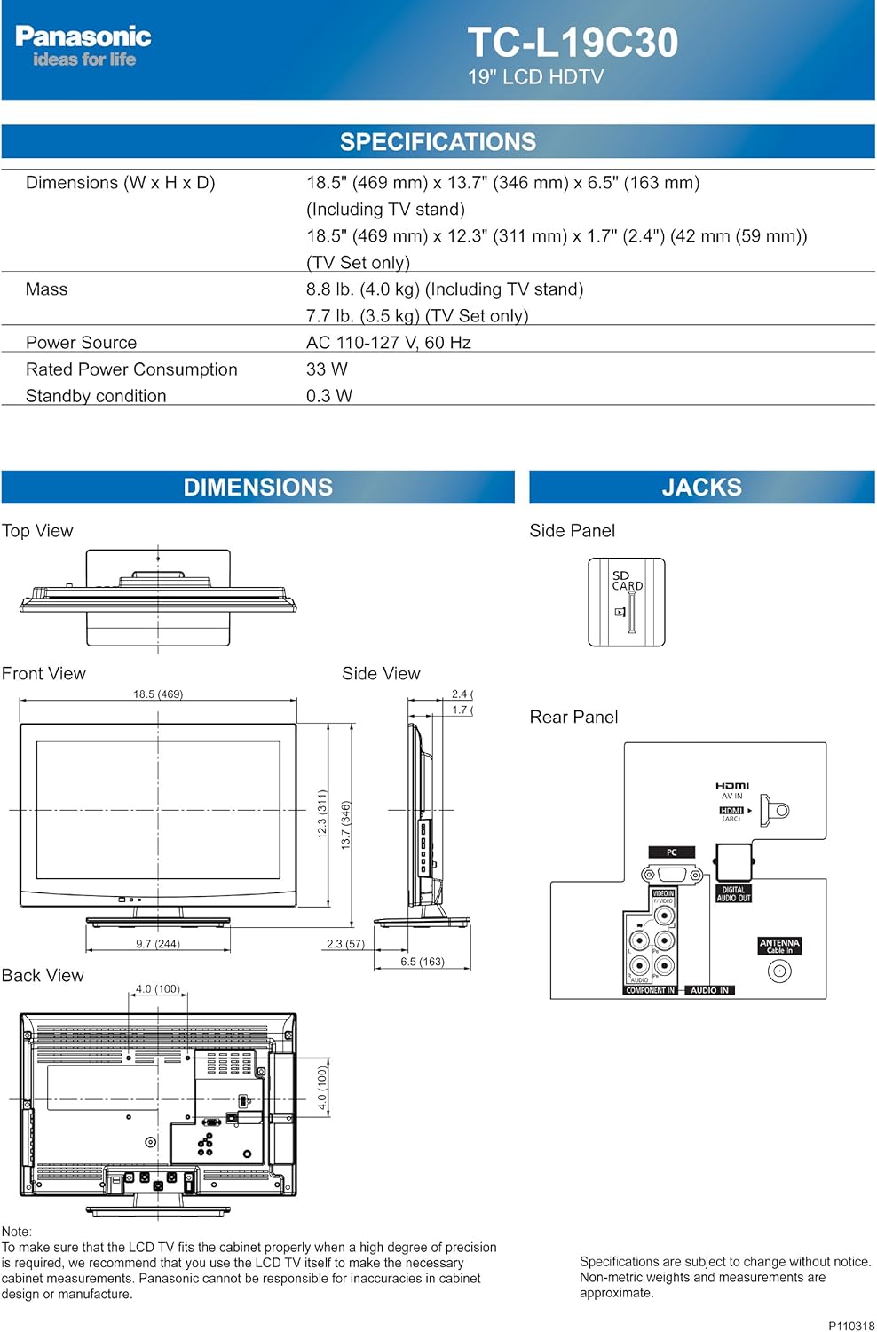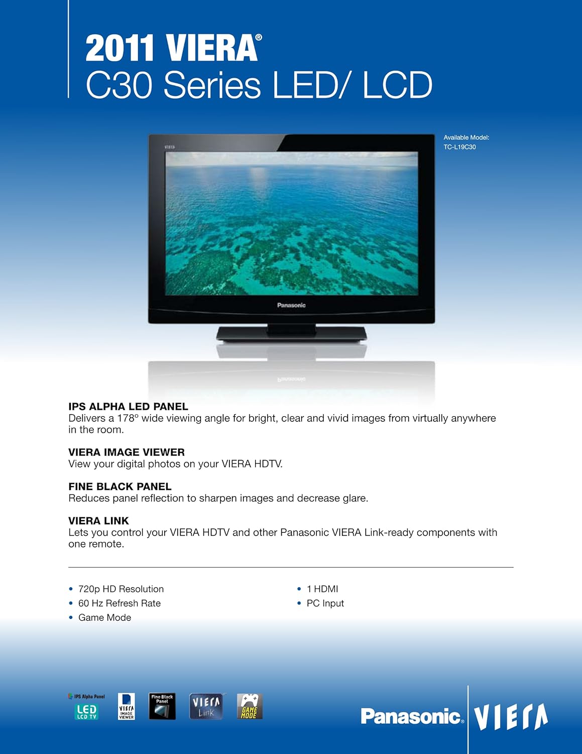 The Panasonic VIERA TC-L19C30 is a 19-inch LED HDTV that delivers vibrant picture quality and immersive entertainment. Featuring an IPS Alpha panel, wide viewing angles, and versatile connectivity options, this TV enhances your viewing experience.