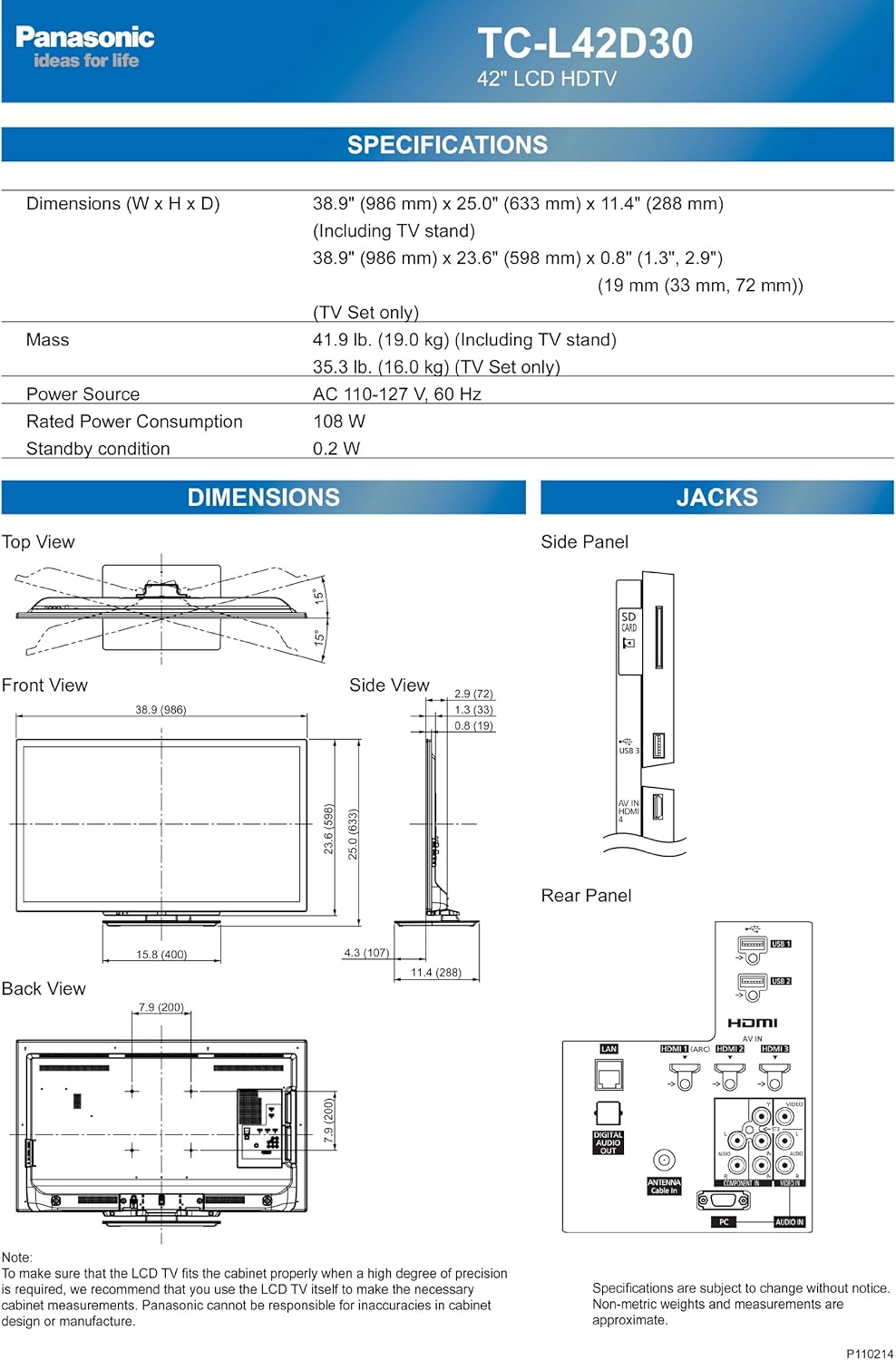 The Panasonic VIERA TC-L42D30 42-Inch 1080p LED HDTV delivers vibrant and detailed images for an exceptional viewing experience. Enjoy easy access to your photos and videos with the built-in SD card slot and explore a world of online content with VIERA Connect.