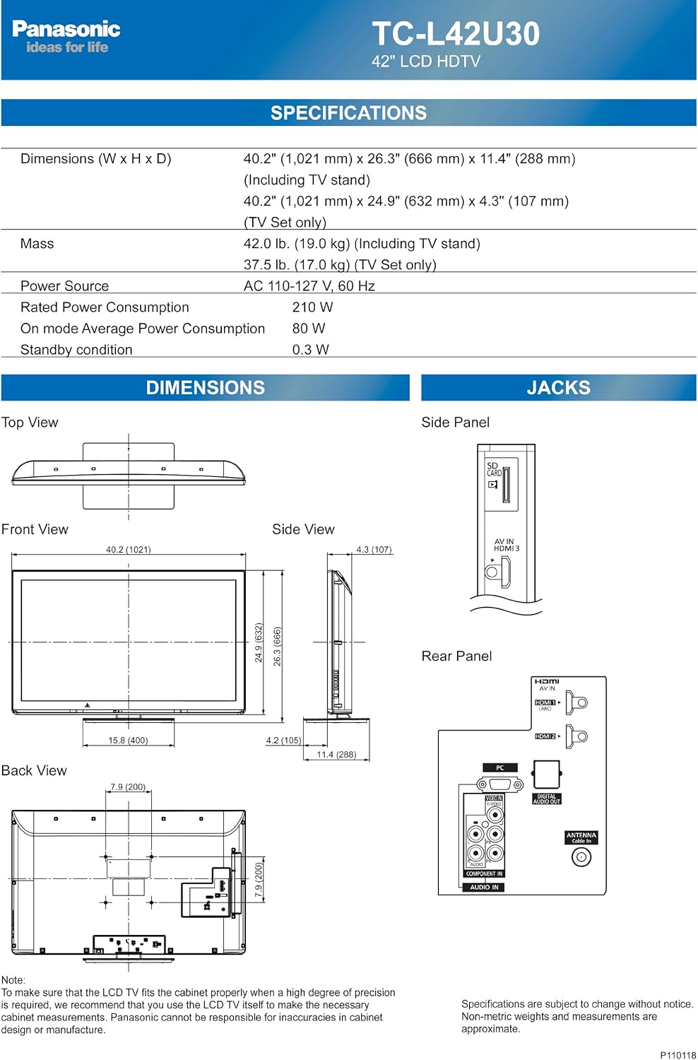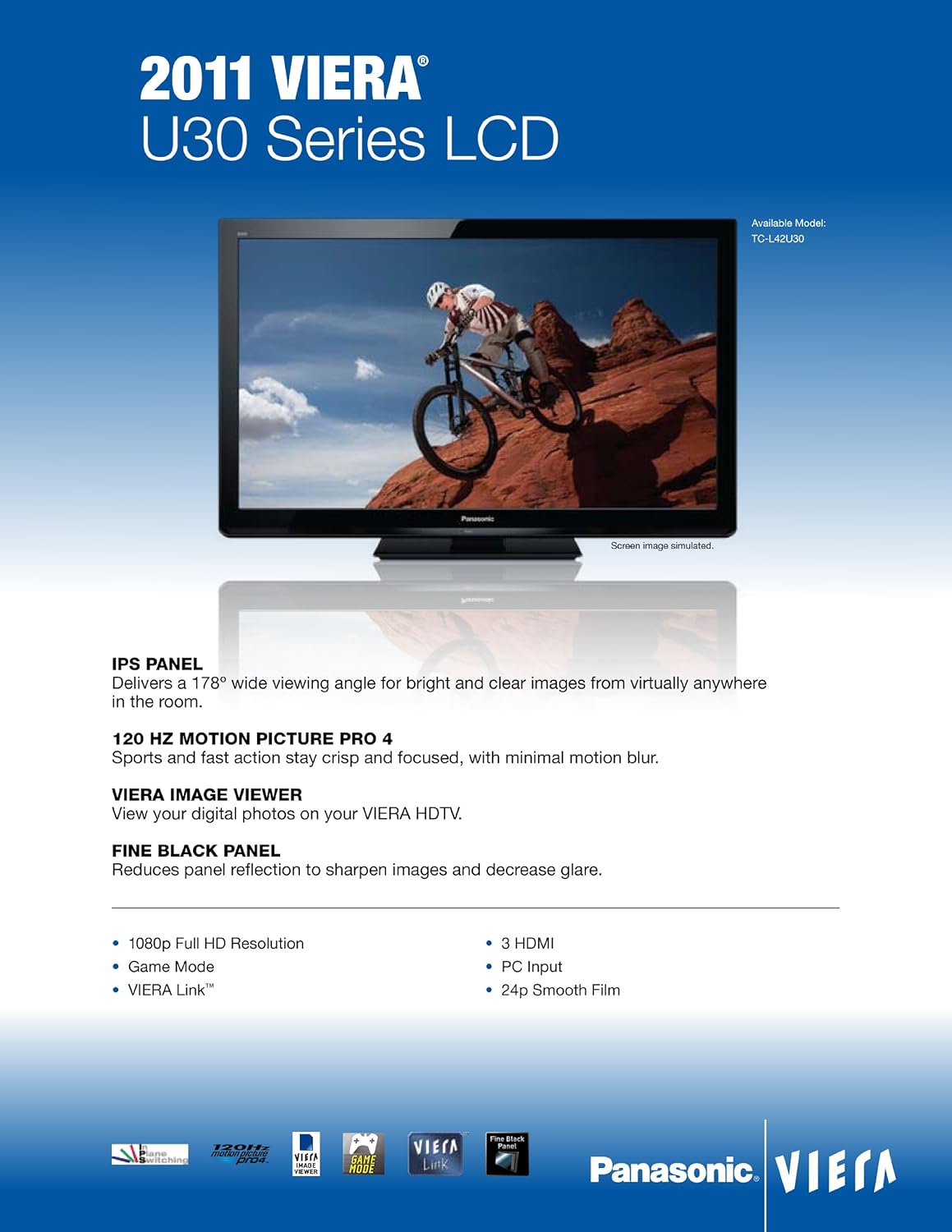 The Panasonic VIERA TC-L42U30 42-Inch LCD HDTV brings your favorite movies, sports, and games to life with its 1080p resolution and 120Hz Motion Picture Pro 4 technology. Featuring an SD card slot for easy viewing of photos and videos, VIERA Link for simplified AV device operation, and a Fine Black Panel for reduced reflections, this HDTV delivers an immersive viewing experience for the whole family.