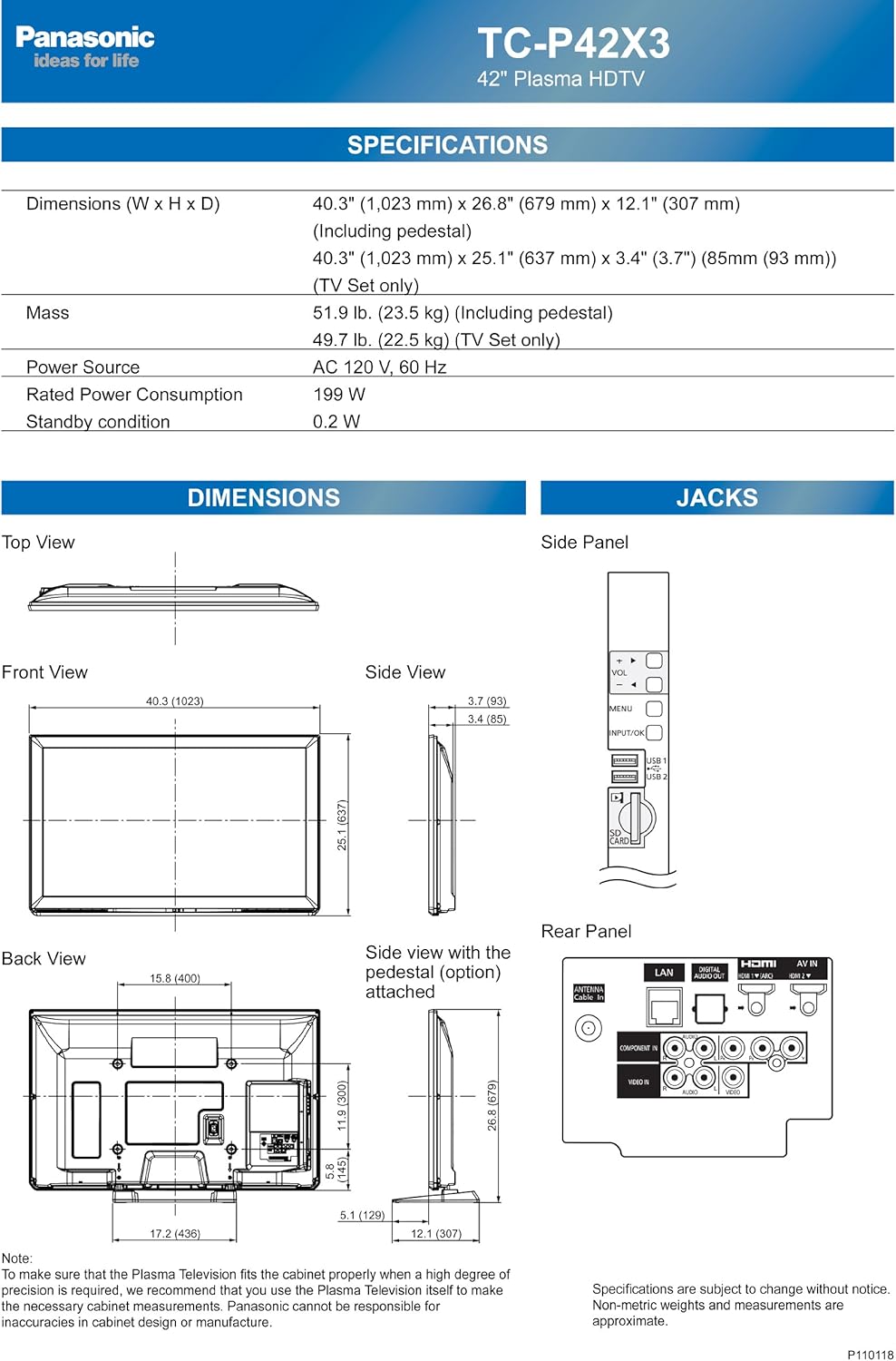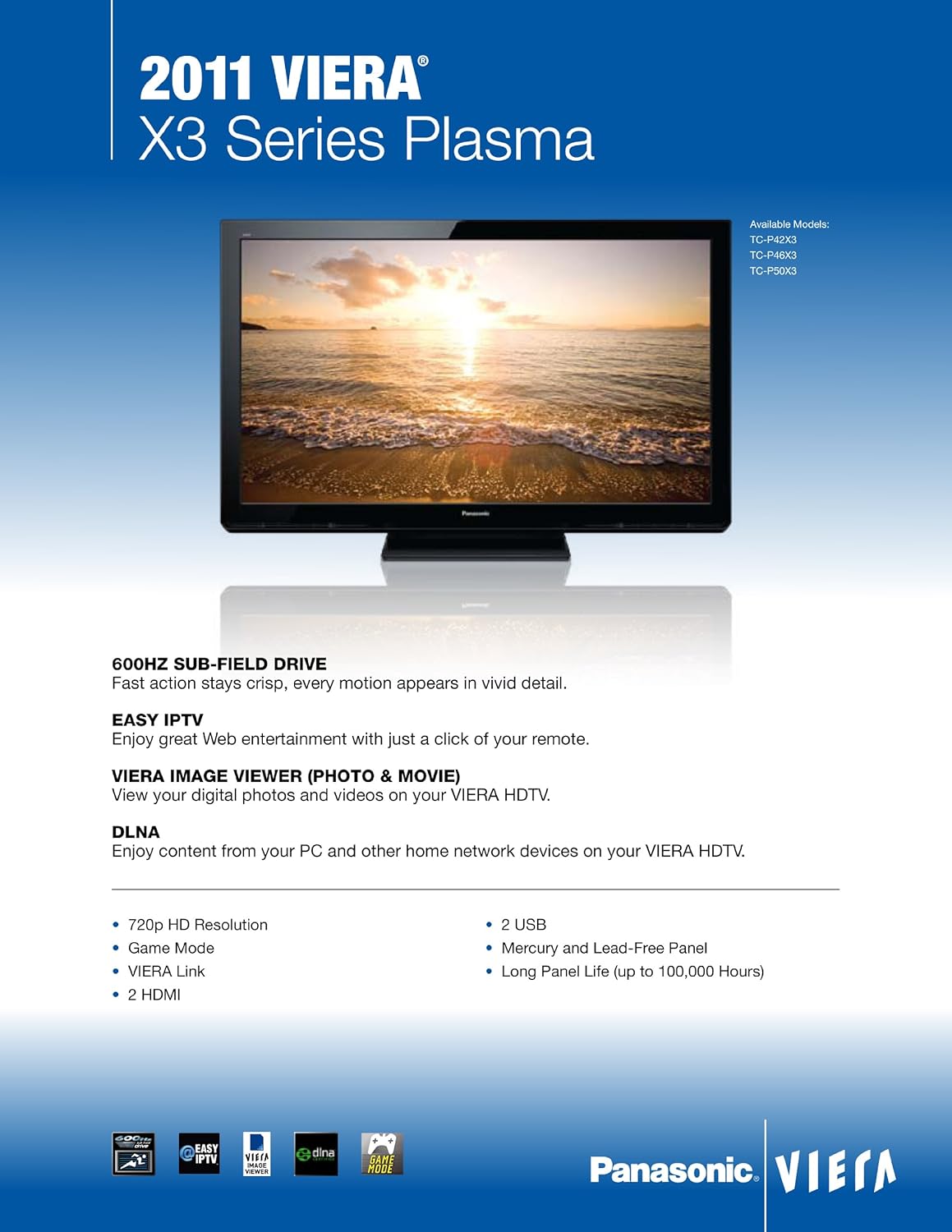 The Panasonic VIERA TC-P42X3 is a 42-inch Plasma HDTV designed to bring your favorite movies, sports, and shows to life. Featuring a 720p resolution and 600Hz Sub-field Drive, this TV delivers crisp, clear images with smooth motion handling for an engaging viewing experience. Enjoy easy access to online content and media sharing capabilities for endless entertainment options.