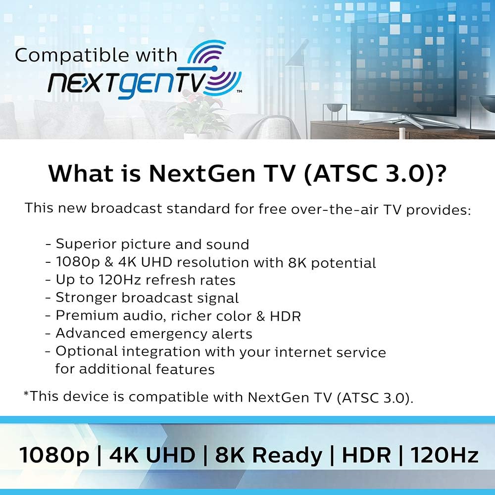 - Compatibility: 4K Ultra HD-ready, Smart TV compatible, NEXTGEN TV (ATSC 3.0) compatible