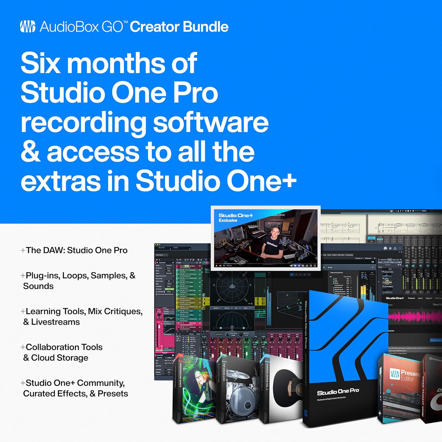 - Software: 6 months of Studio One+ (Studio One Pro DAW recording software)