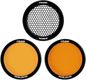 The Profoto Clic Grid and Gel Kit provides essential light-shaping tools for photographers using Profoto C1 Plus, A1X, and A1 flashes. This kit includes a Clic Grid, Full CTO Gel, and Half CTO Gel, offering creative control over light spread, contrast, and color temperature.
