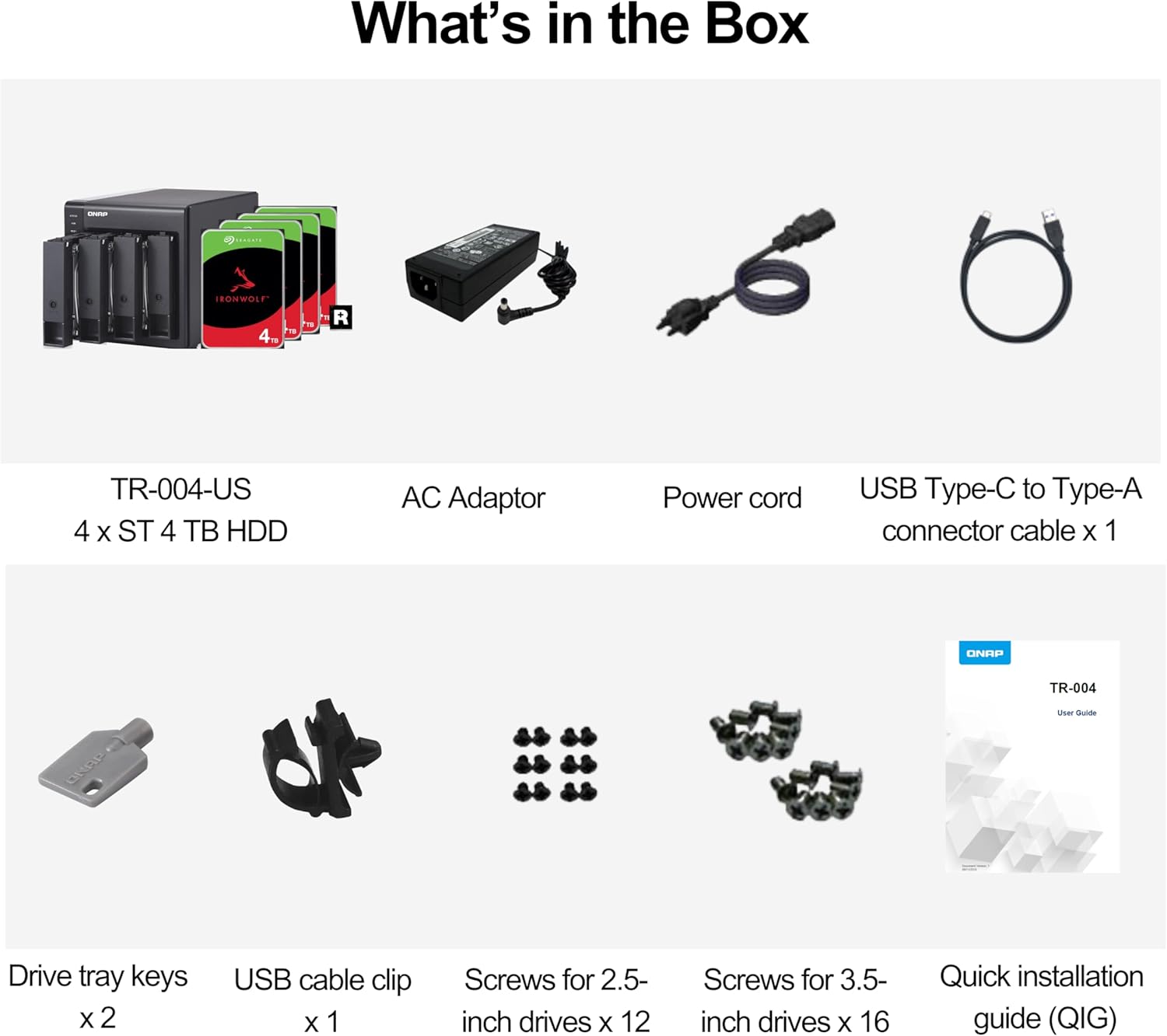 Secure your data with the QNAP TR-004, a versatile 4-bay Direct-Attached Storage (DAS) enclosure. Preconfigured with 12TB of storage using Seagate IronWolf HDDs in RAID 5, this bundle offers both high capacity and data protection. Connect via USB Type-C for fast and easy access to your files on Windows, macOS, and Linux systems.