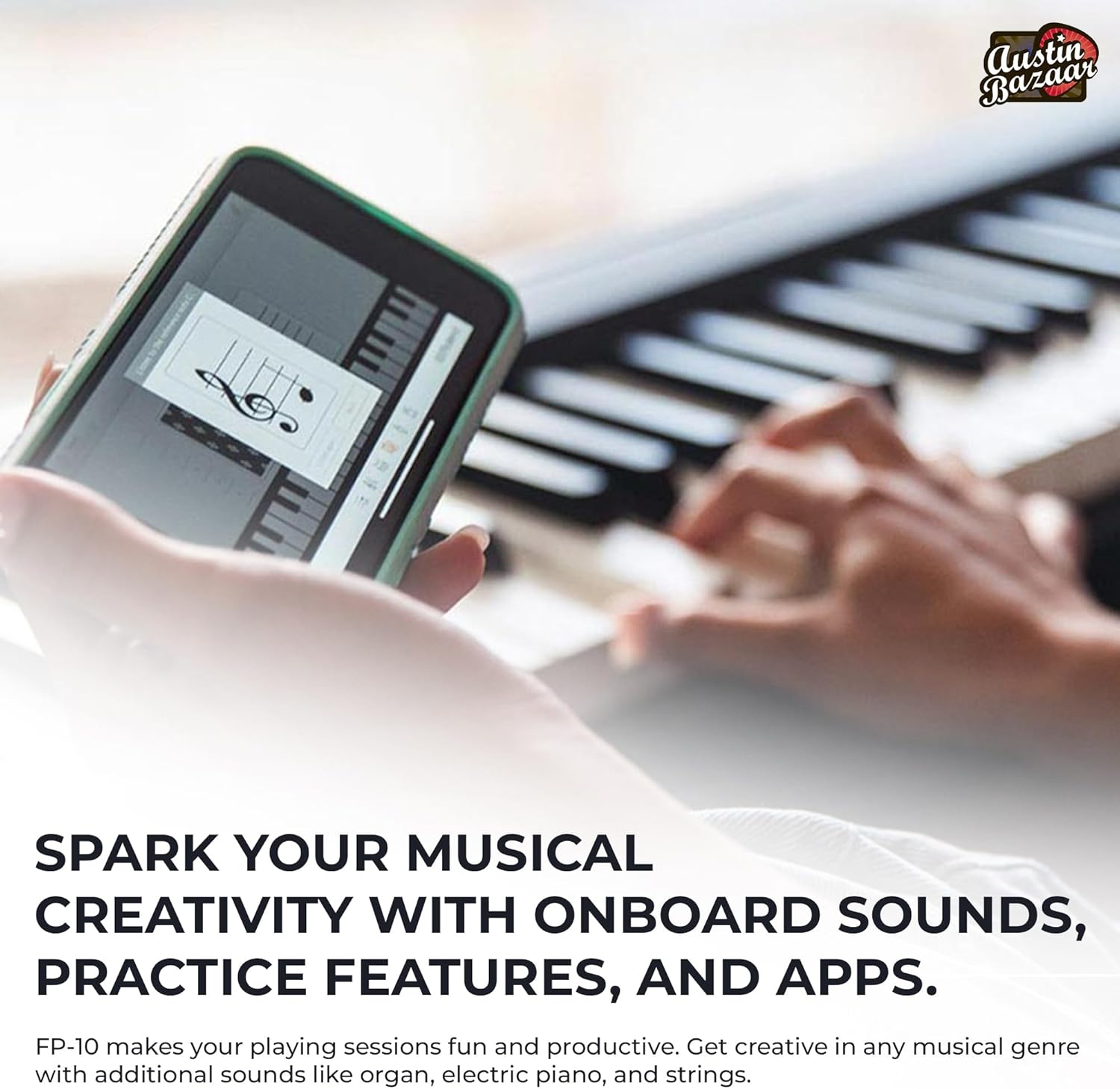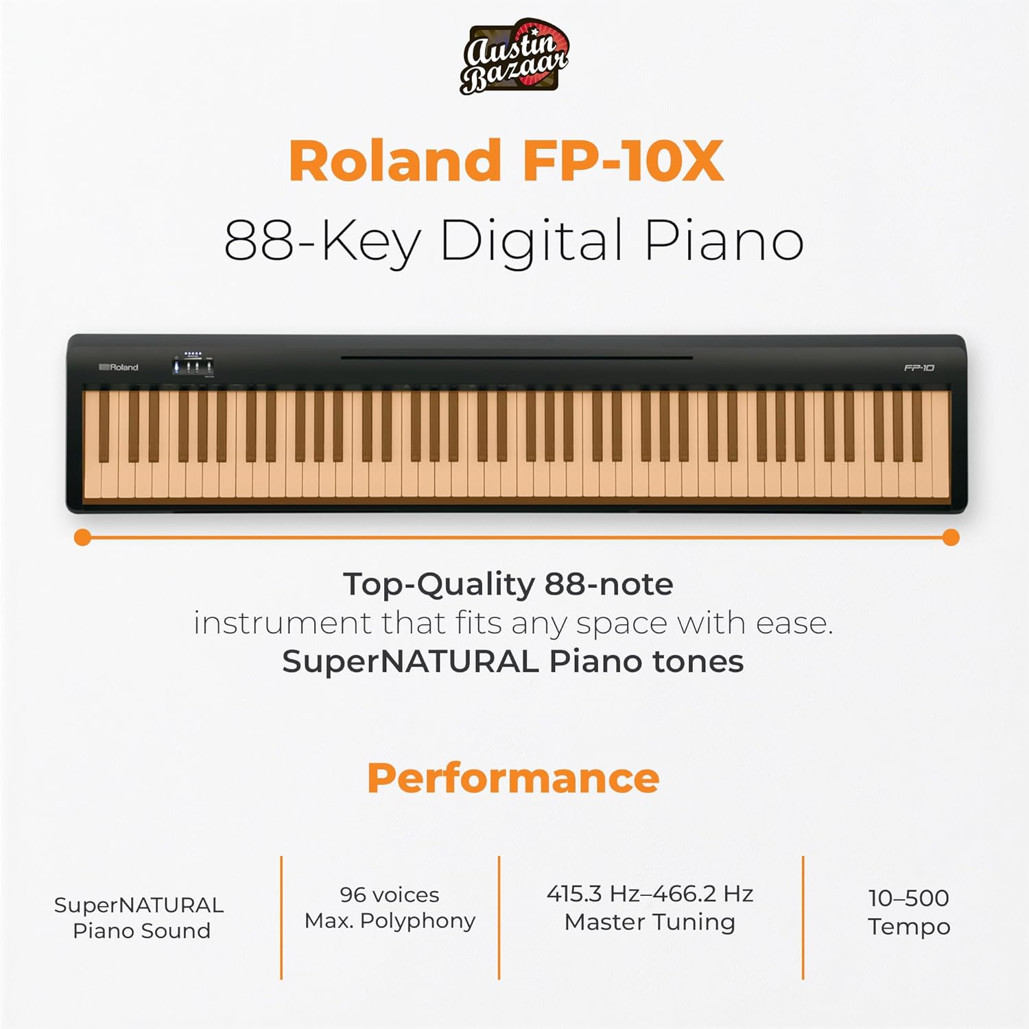 The Roland FP-10 Digital Piano delivers exceptional performance in a compact and stylish design. Experience the renowned SuperNATURAL Piano sound engine for rich, expressive tones and the PHA-4 Standard keyboard for a natural, responsive touch. Perfect for beginners and seasoned players alike, the FP-10 offers seamless connectivity and a complete bundle of accessories to get you started on your musical journey. Specifications:- Keyboard: 88 keys with PHA-4 Standard keyboard