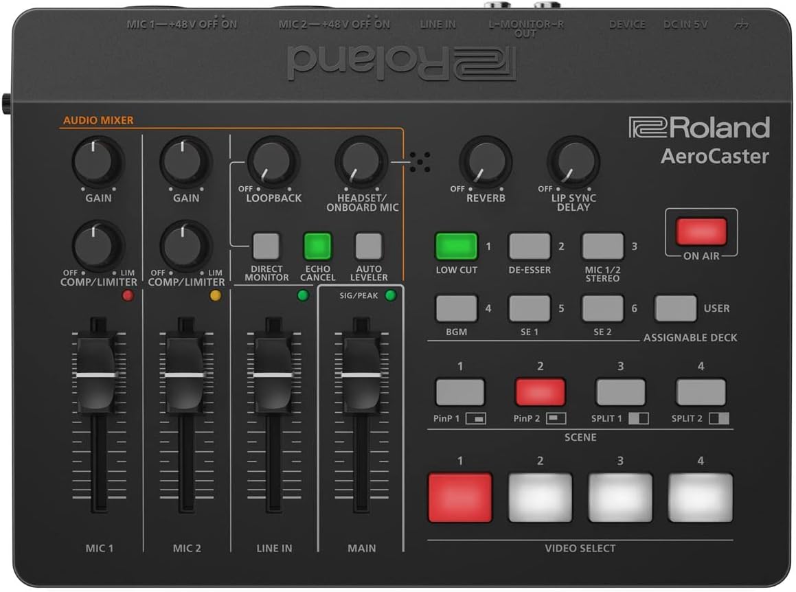The Roland AeroCaster Live Streaming System offers a powerful and intuitive solution for creating professional-quality multi-camera livestreams. This wireless system allows you to easily switch between multiple devices, share screens, and add engaging graphics, all controlled via a user-friendly iPad app and hardware interface. Perfect for online talk shows, music performances, and remote education, AeroCaster makes it easy to produce captivating live content.