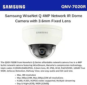 The Samsung WiseNet QNV-7020R is a 4-megapixel network camera designed for outdoor surveillance. Offering both color and monochrome imaging, this vandal-resistant dome camera provides clear and reliable security monitoring in various weather conditions.