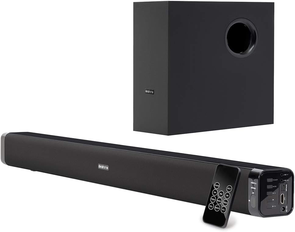 - Included: Deco Gear 60W Soundbar with Subwoofer, Wall Mount Kit, Wireless Keyboard, Cleaning Kit, Surge Adapter