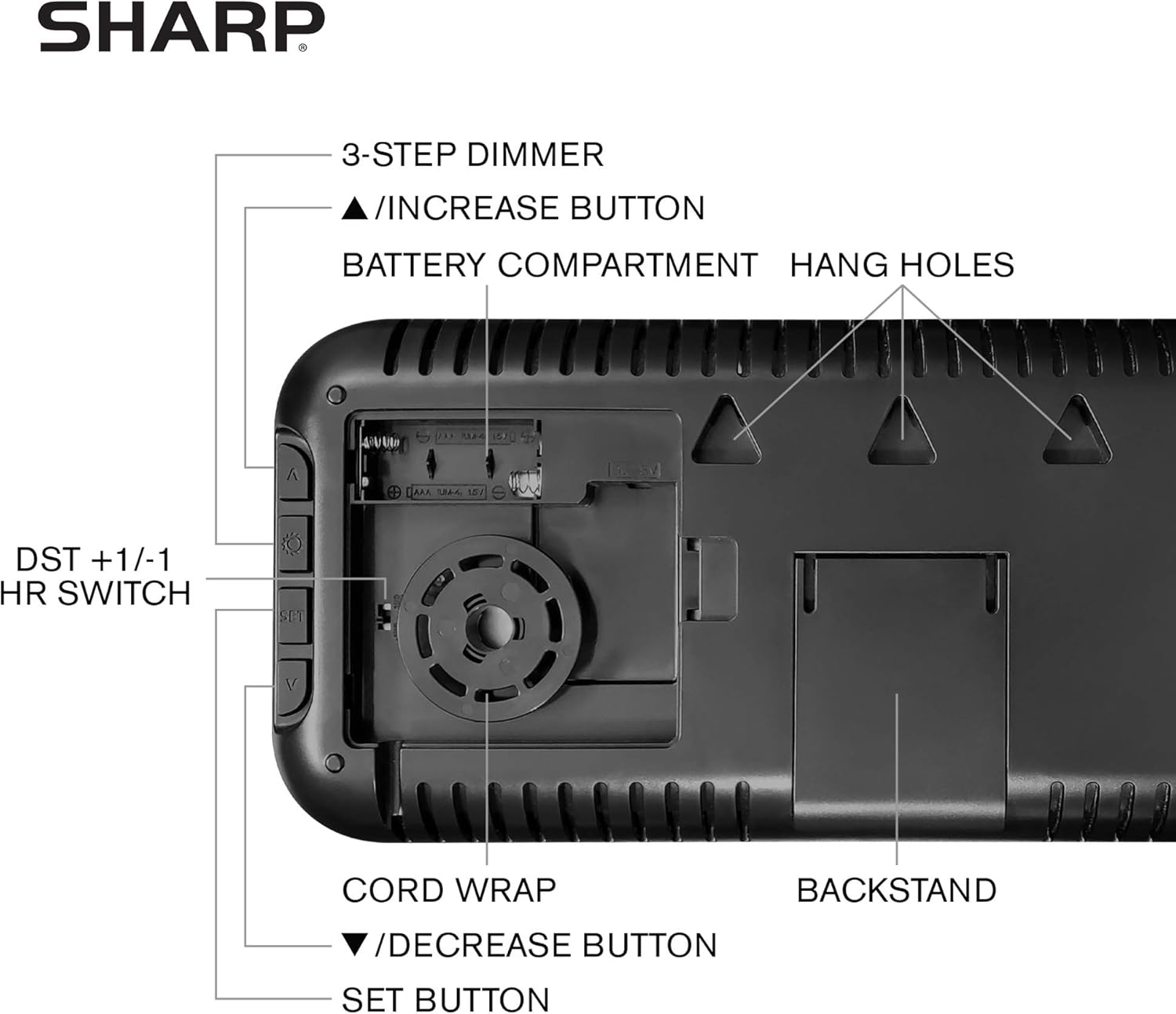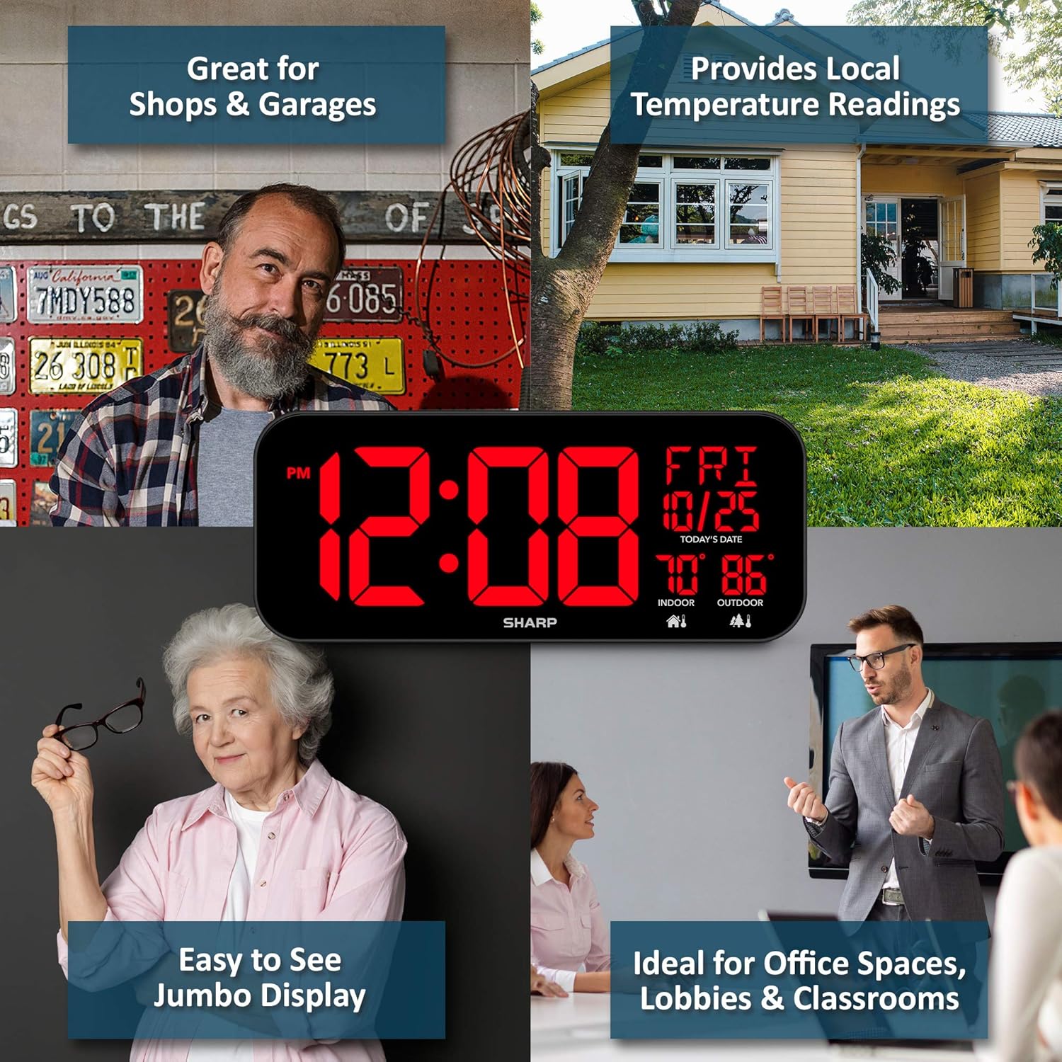 Introducing the Sharp Oversized Screen LED Clock, a versatile timekeeping solution with both indoor and outdoor temperature display. Featuring large, easy-to-read digits and a wireless outdoor sensor, this clock provides at-a-glance information about the time, date, and temperature. The sleek design and convenient mounting options make it perfect for any room or office space.