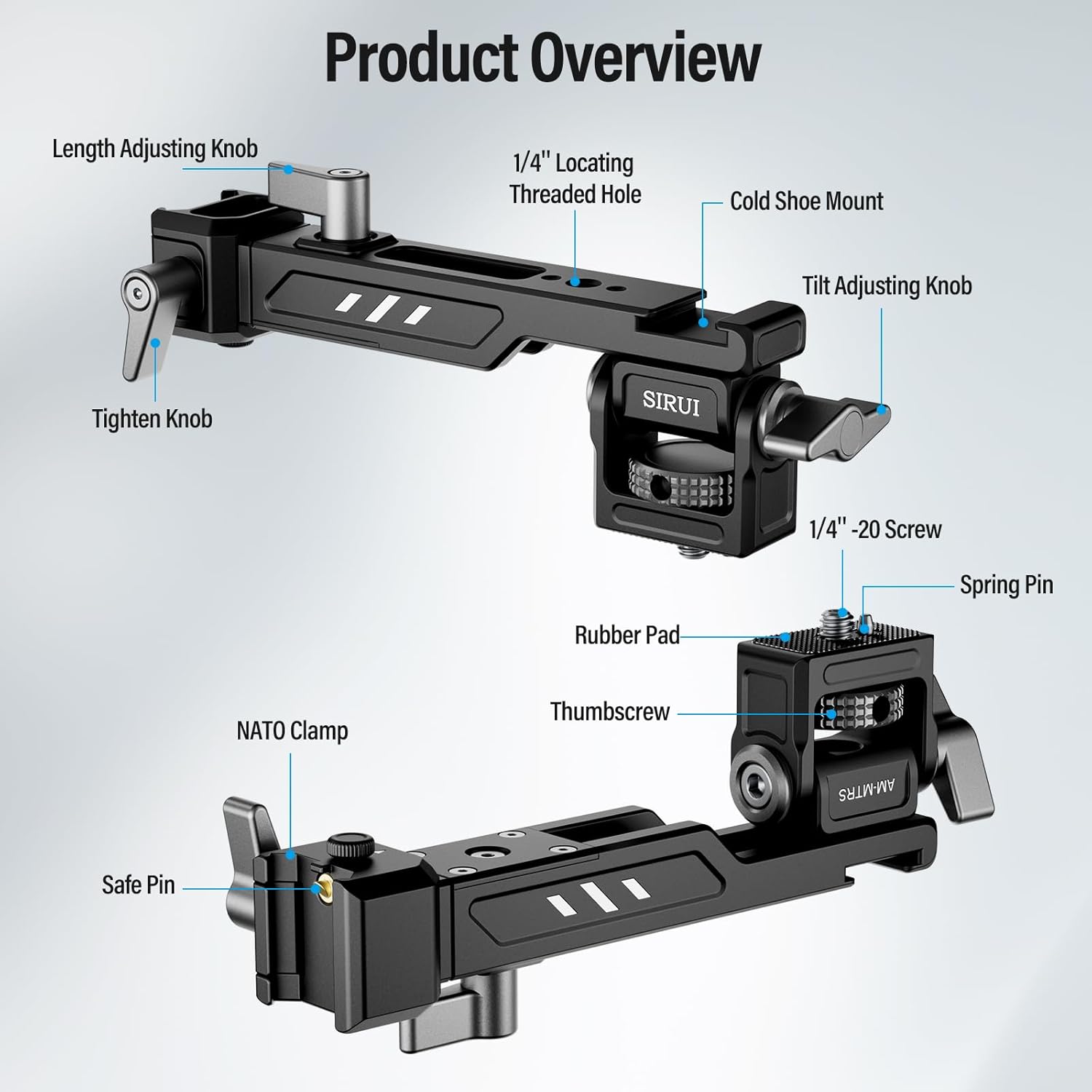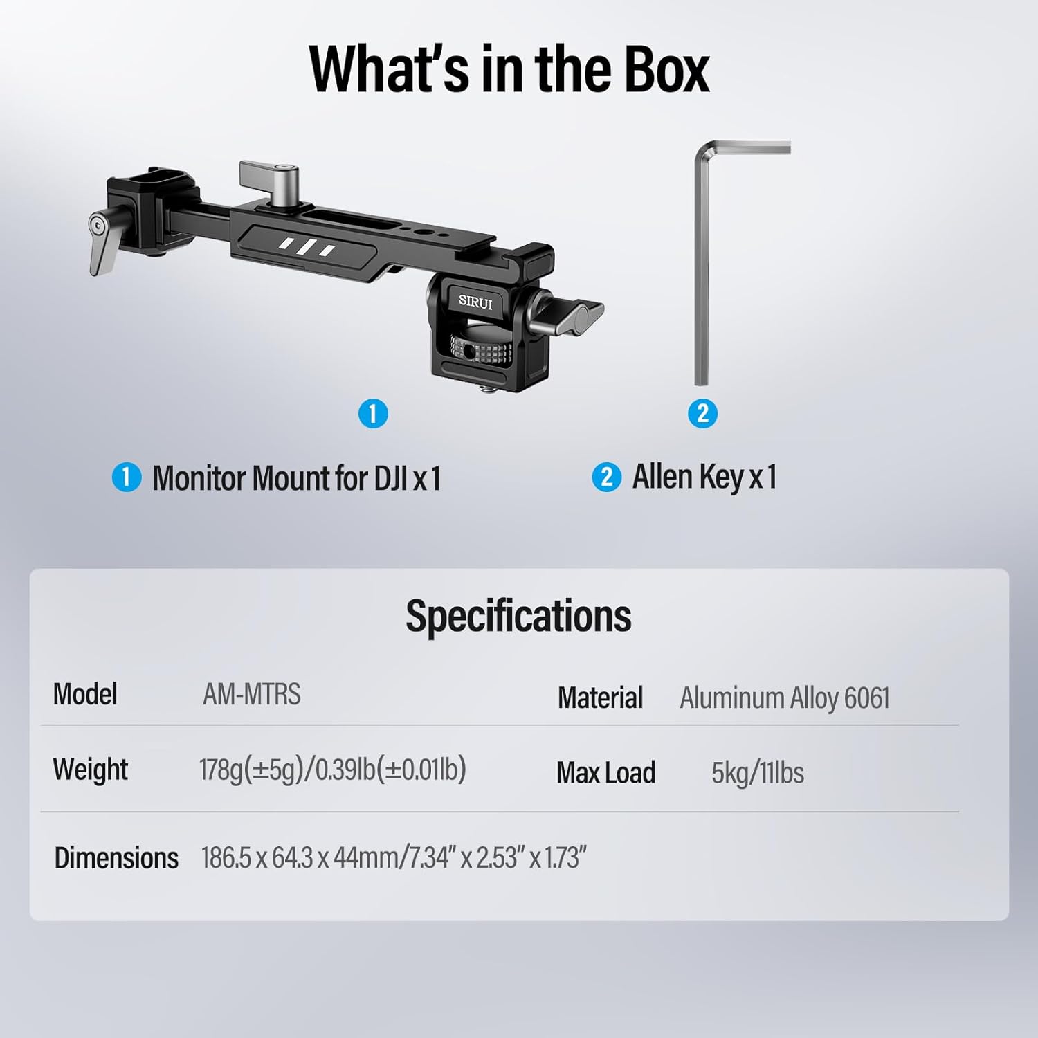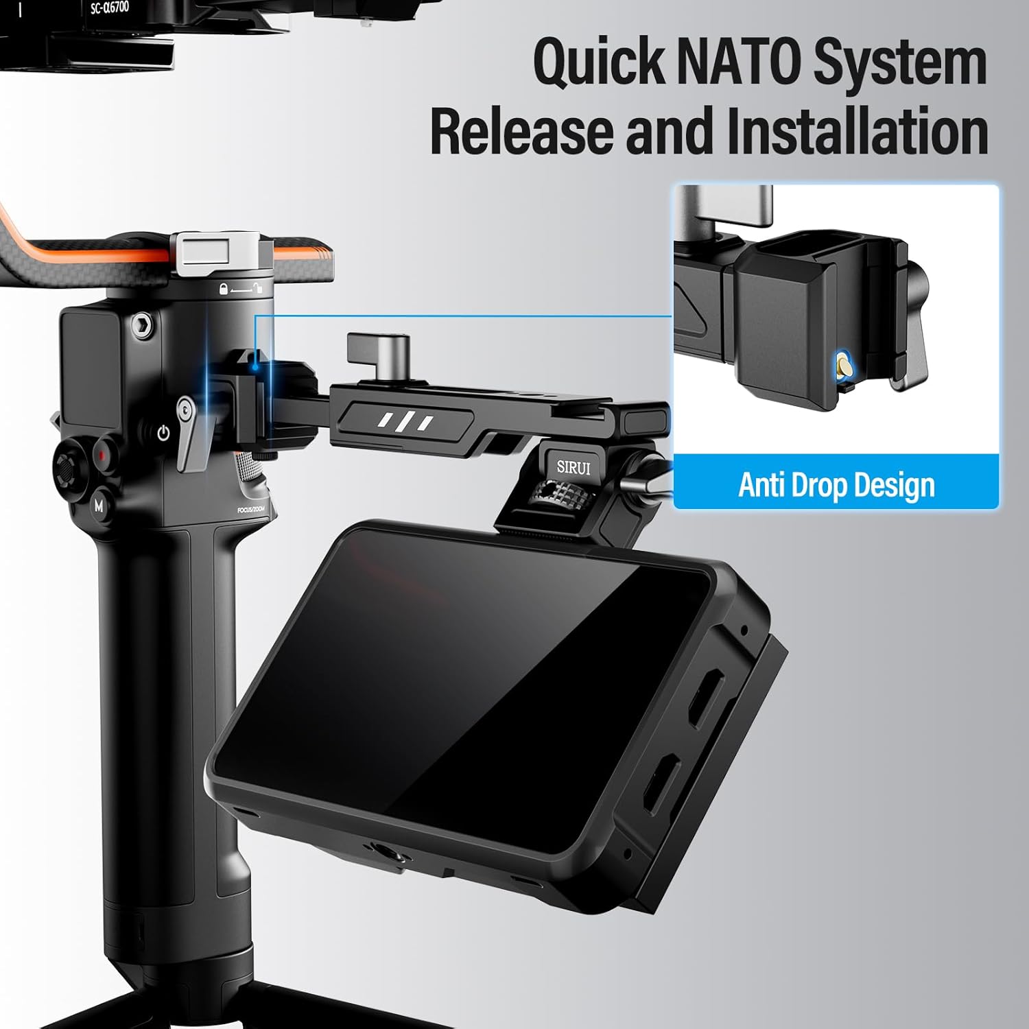 The SIRUI Monitor Mount AM-MTRS is designed specifically for DJI RS series gimbals, offering a secure and adjustable solution for attaching external monitors and other accessories. With a quick-release NATO clamp, 360° swivel, and 180° tilt adjustment, this mount provides maximum flexibility and stability.