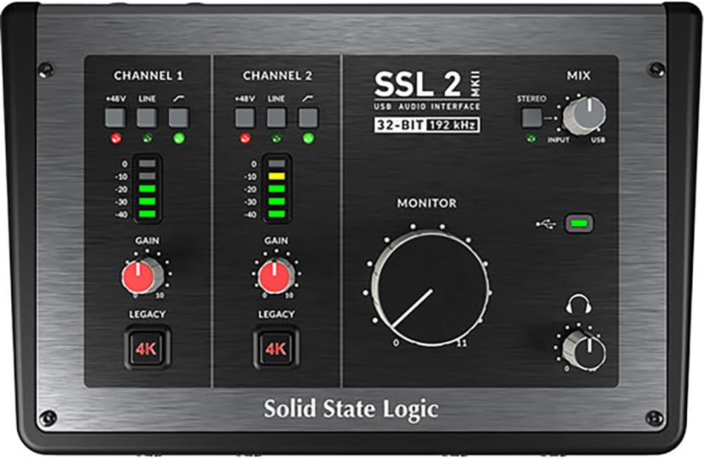 The Solid State Logic SSL 2 MKII is a 2x2 USB audio interface designed to bring studio-quality sound to your home or on the road. With high-grade mic preamps, next-gen converters, and legacy 4K analog enhancement, this interface ensures professional recordings.